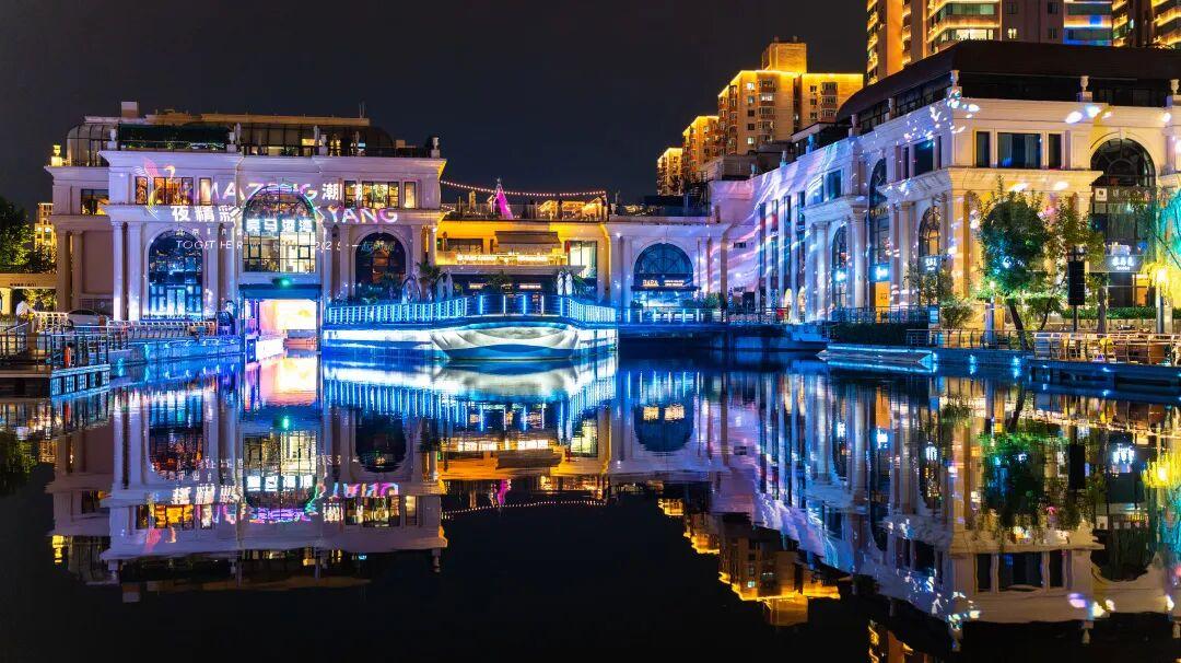 “魔方”是灯光消费季的核心装置,含13.5米直径巨型机械立方体与6米宽环形水上舞台,一键切换剧场、秀场、展演场。夜幕下,这座大型新媒体交互艺术装置化身演艺剧场等空间,融入未来科技、国潮等元素,每一次转动和光影变幻,都如同打开亮马河畔的“惊喜盲盒”,诠释水岸N种生活方式,让水波、光影与舞美共振,游人可探索潮朝阳的精彩夜晚。