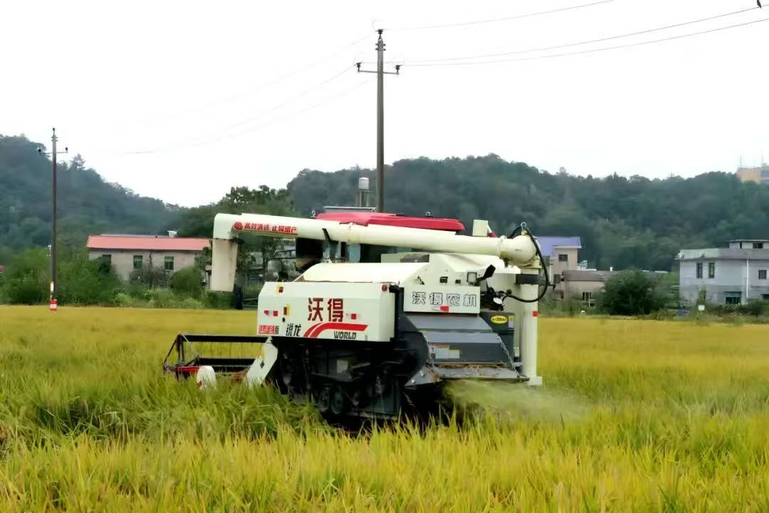 在含浦街道九丰村,种粮大户林胜强将收割机缓缓开进自己的稻田中。伴随着机械轰鸣声,收割机在稻田中来回穿梭,将稻谷迅速收割、脱粒、碎秆还田,脱粒后的稻谷从收割机传送管中倾泻而落。