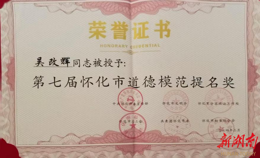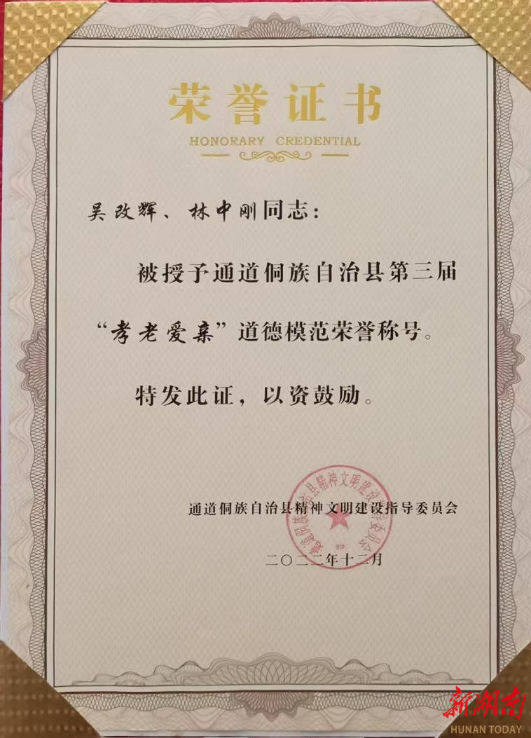 除了创业,林中刚还不忘回馈社会。作为残疾人代表,他积极为残疾人发声。2022年,吴改辉、林中刚被评为通道侗族自治县第三届“孝老爱亲”道德模范;2024年,吴改辉获得第七届怀化市道德模范提名奖。