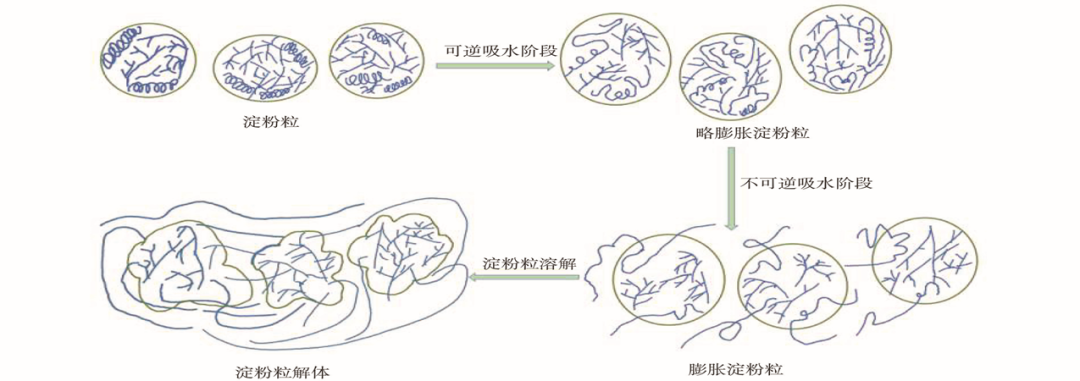 大米的主要成分是淀粉,在干燥状态下,淀粉以紧密的颗粒形式存在,不易被消化。当大米与足量的水长时间共同加热(即熬粥的过程),淀粉颗粒会吸水膨胀、破裂,并溶解在水中,形成一种黏稠的糊状物。这个过程就是糊化[4]。