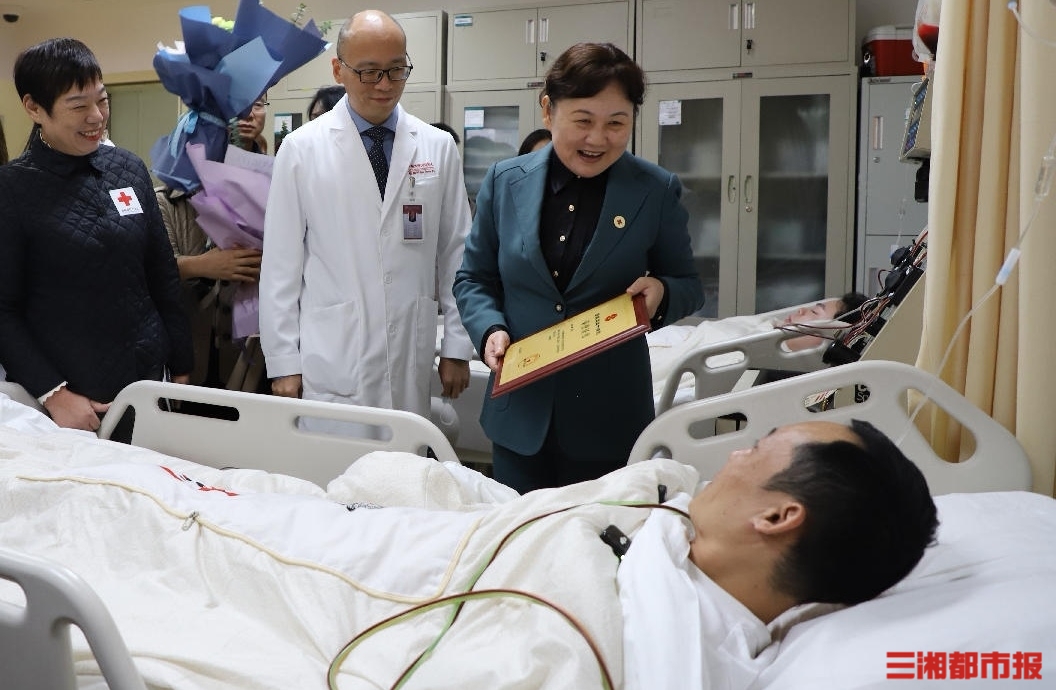 今日的采集过程中,湖南省红十字会党组书记、常务副会长冷晓君,中南大学湘雅医院党委委员、副院长钱招昕等专程到场慰问,为皮彭颁发荣誉证书。
