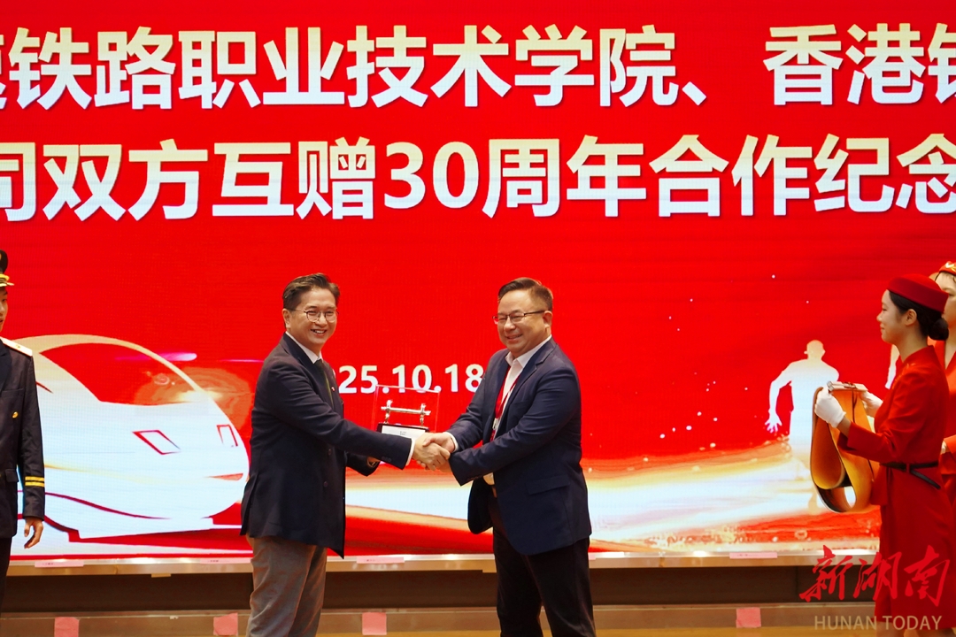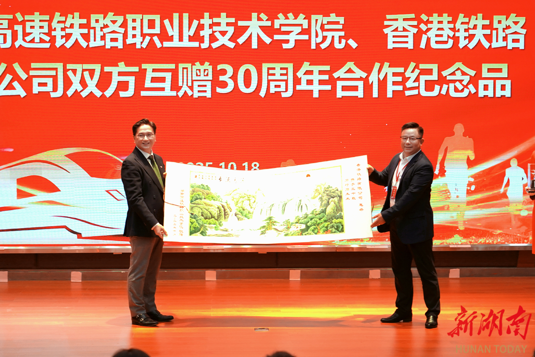 随后,校企双方互赠纪念品。香港铁路有限公司赠送的纪念品,以钢轨和车轮为原型,寓意“校企同心·一路同行”,象征港铁和高铁职院合作关系如轨道与车轮般密不可分。学院赠送湘绣纪念品《源远流长》,寓意三十年的发展历程与未来的无限延续,象征校企合作根基深厚、生生不息、历久弥新。