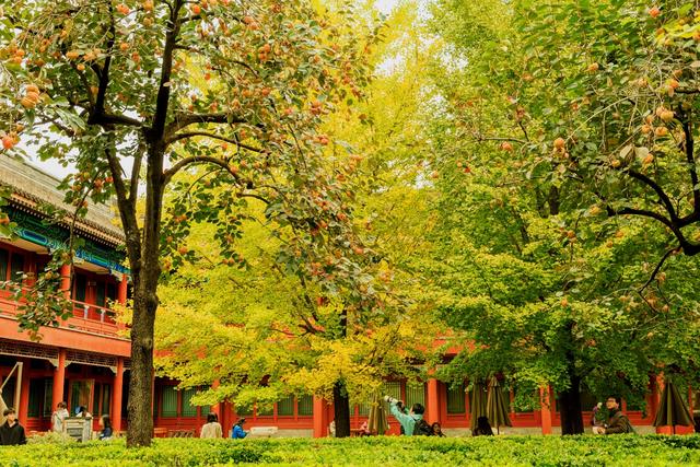 北京石刻艺术博物馆更是刷屏了很多人的朋友圈。金色爬上600岁古银杏枝头,古塔前的柿子树缀满了累累果实,“古塔柿景”限时上线。观众张先生说:“地方不大,但搭配上银杏、柿子,秋日的趣味倍儿浓。”还有网友在线上发布攻略,“用双色银杏做前景,红色的大门当背景,更出片”。