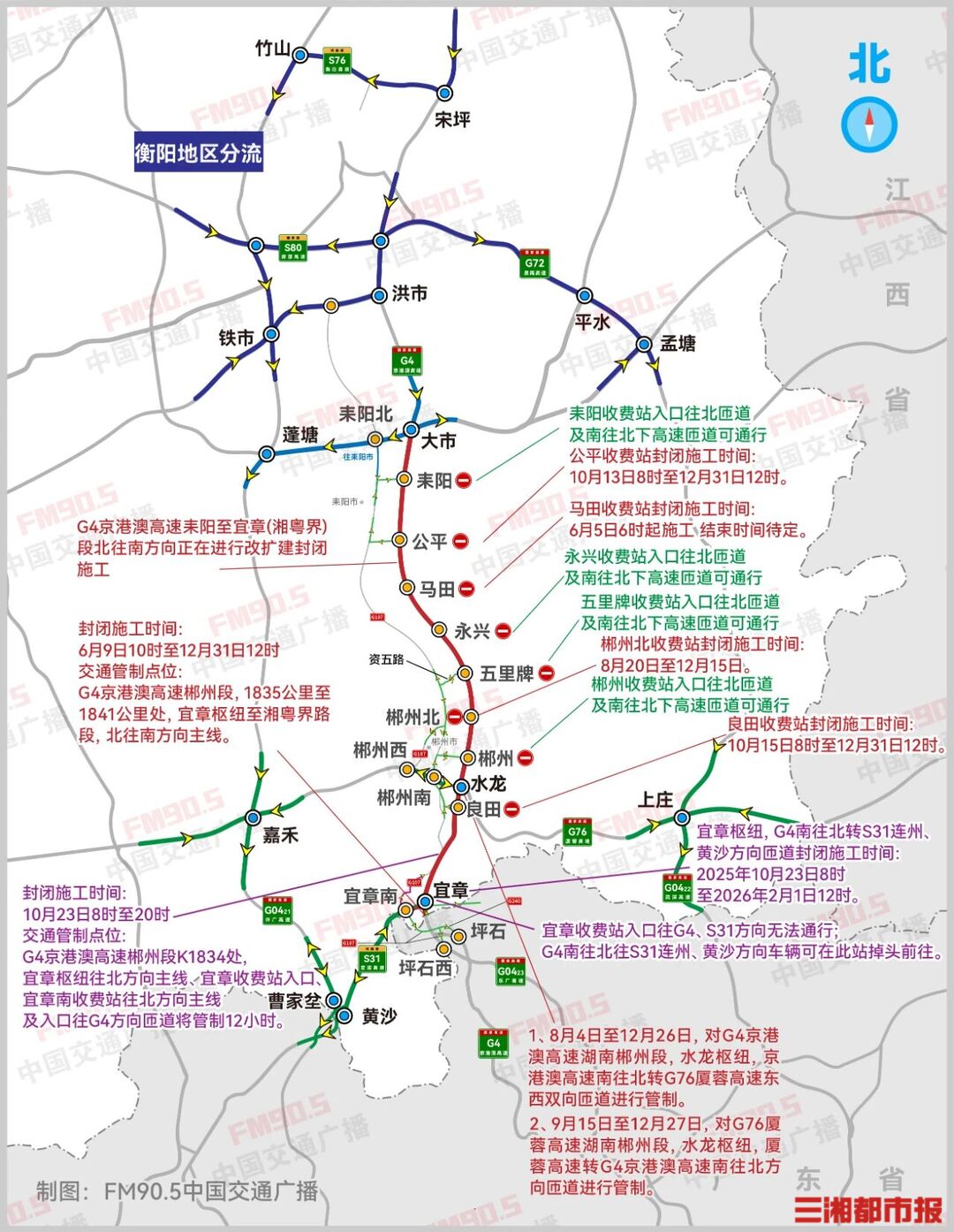 三湘都市报·新湖南客户端10月21日讯(全媒体记者 李致远)10月21日,记者从湖南高速集团郴州分公司获悉,因G4京港澳高速耒阳大市至宜章(湘粤界)段改扩建工程施工,需开展交通转换、跨线桥拆除及桥梁建设作业,具体管制信息如下: