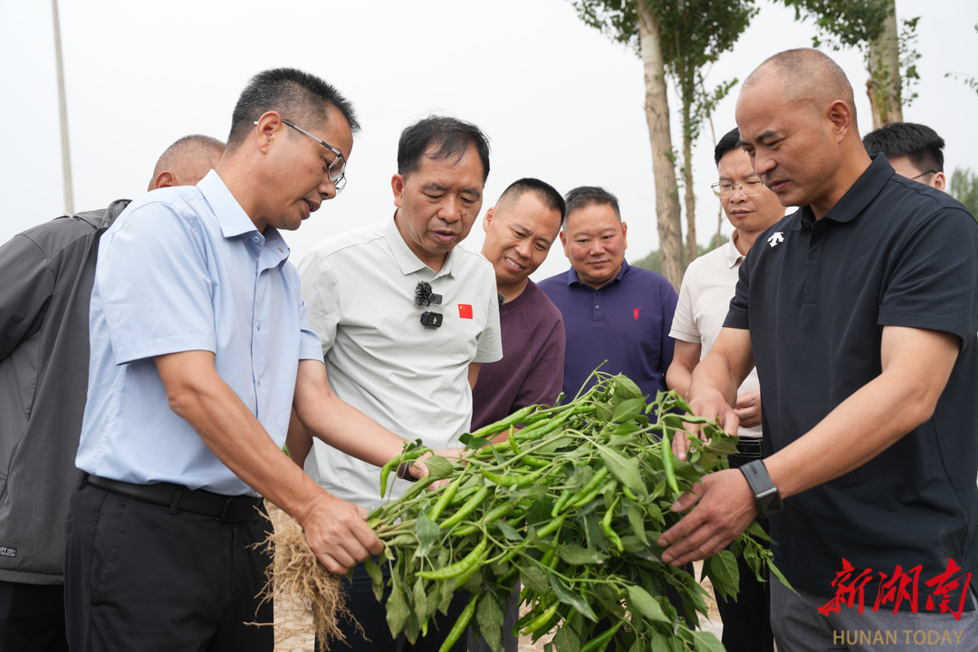 7月29日,新疆维吾尔自治区巴音郭楞蒙古自治州,邹学校(中)查看辣椒生长情况。