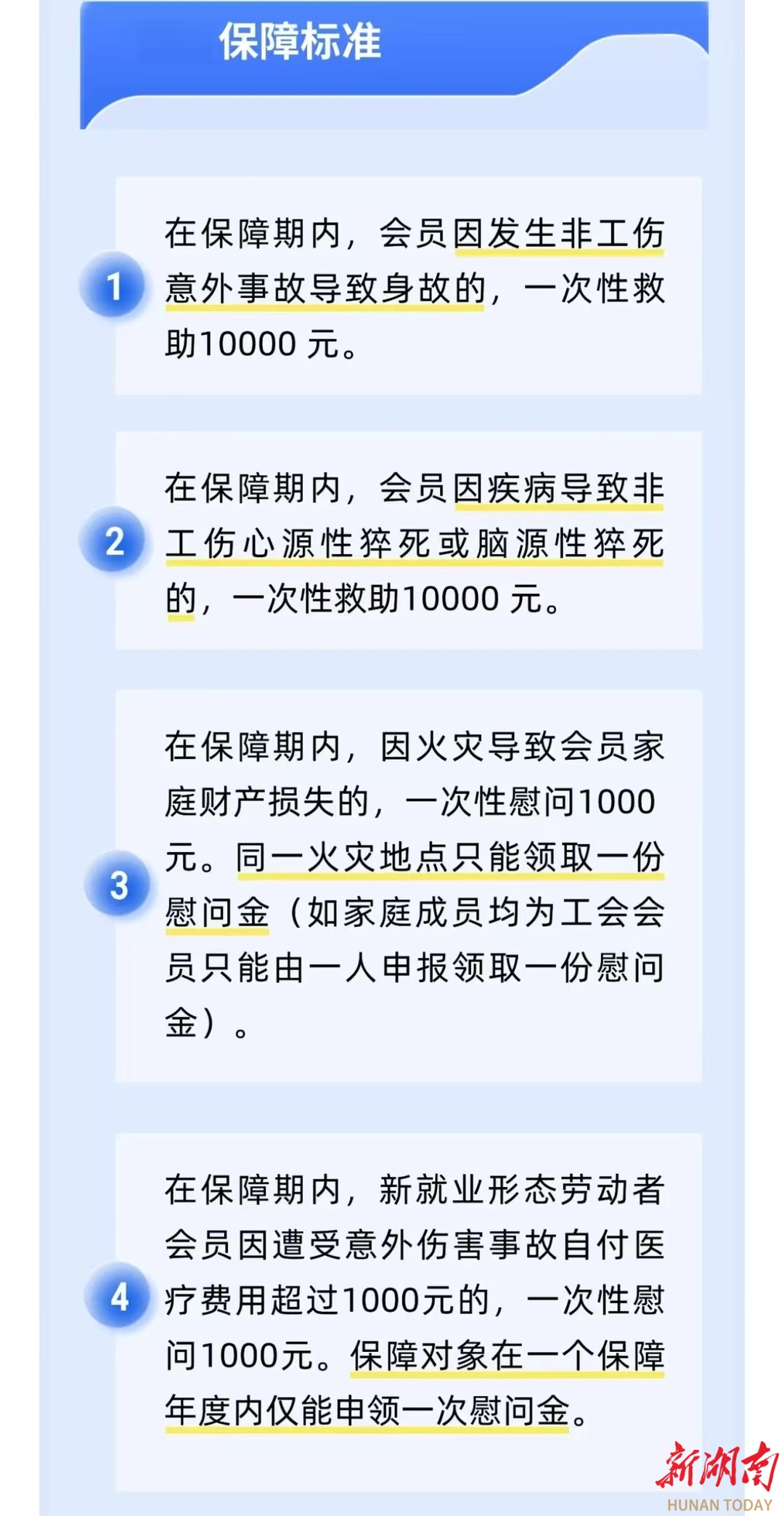 今起至2026年7月16日,长沙地区加入工会的职工从事非职业活动或与职业行为无关的活动时,遭受任何外来的、突然的、非本意的、非疾病的剧烈伤害导致死亡,工会一次性救助10000元。职工因潜在心脑血管疾病,在送到医疗机构之后的抢救期内,发生心源性猝死、脑源性猝死,工会一次性救助10000元。职工自有或租住他人的合法房产,发生火灾且经消防部门处置,过火面积超过5平方米并造成家庭财产损失,工会一次性慰问1000元。