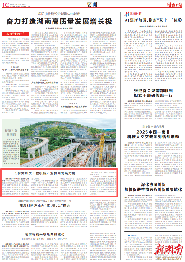 湖南日报10月21日讯(全媒体记者 李治)20日,2025长株潭工程机械产业生态协同发展活动在长沙经开区举行。长株潭工程机械数字化转型联合体、长株潭产业协同发展企业服务平台、国家重大工程服务联盟三大机制同步落地,标志着长株潭工程机械产业主配协同、跨区域协作与技术创新迈入新阶段。