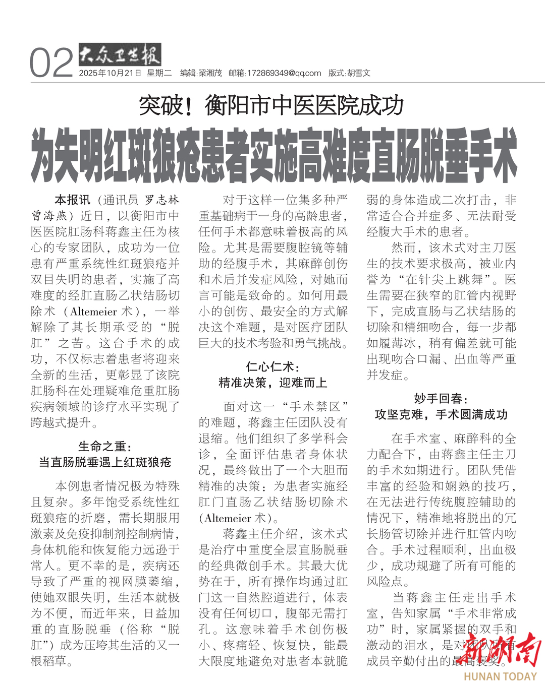 大众卫生报·新湖南客户端10月22日讯(通讯员 罗志林 曾海燕)近日,以衡阳市中医医院肛肠科蒋鑫主任为核心的专家团队,成功为一位患有严重系统性红斑狼疮并双目失明的患者,实施了高难度的经肛直肠乙状结肠切除术(Altemeier术),一举解除了其长期承受的“脱肛”之苦。这台手术的成功,不仅标志着患者将迎来全新的生活,更彰显了该院肛肠科在处理疑难危重肛肠疾病领域的诊疗水平实现了跨越式提升。