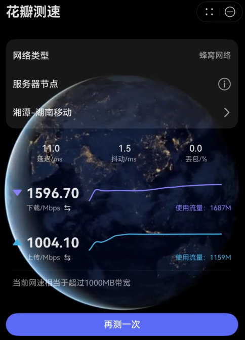 本次验证中,湖南移动在湘潭大学部署了F/A SUL大规模天线阵列AAU基站解决方案,通过创新性地将F/A频段和4.9G频段上行资源灵活联合调度,F/A频段在4.9G频段下行发射时接收上行数据,实现全时段上行数据接收,极大拓展了上行优质体验的边界。本次采用PuraX商用终端,在近点达成单用户上行1004Mbps峰值体验,在边缘弱覆盖点上行也能稳定达成20Mbps的体验。
