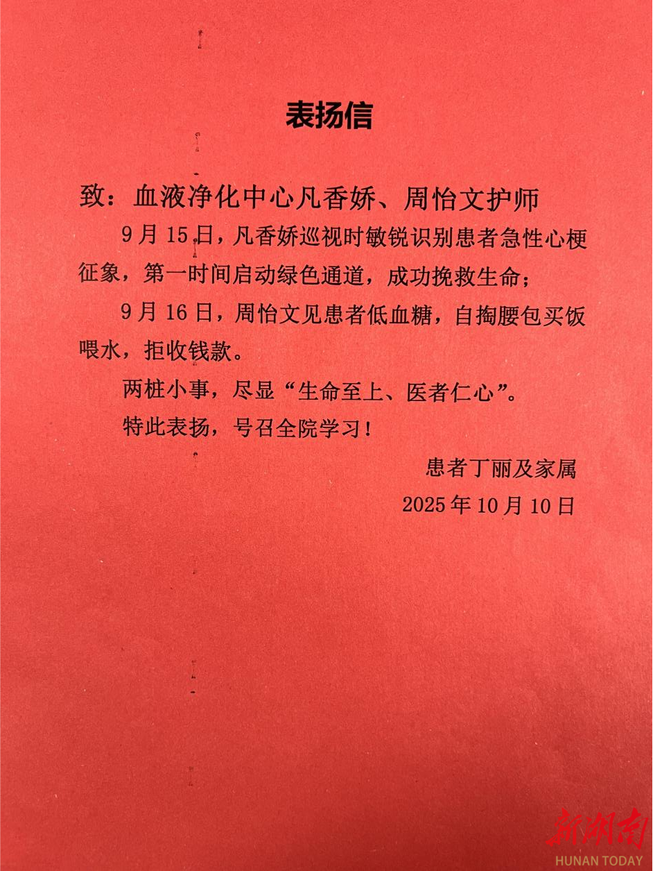 湖南日报·新湖南客户端10月22日讯(通讯员 涂铭珊)近日,一封来自患者丁丽及家属的感谢信,让南华大学附属第二医院血液净化中心的凡香娇、周怡文两位护师的故事为人所动容。信中记录了两天内发生的两件“小事”,于细微处见证了“生命至上”的信念,于危急时彰显了“医者仁心”的担当。