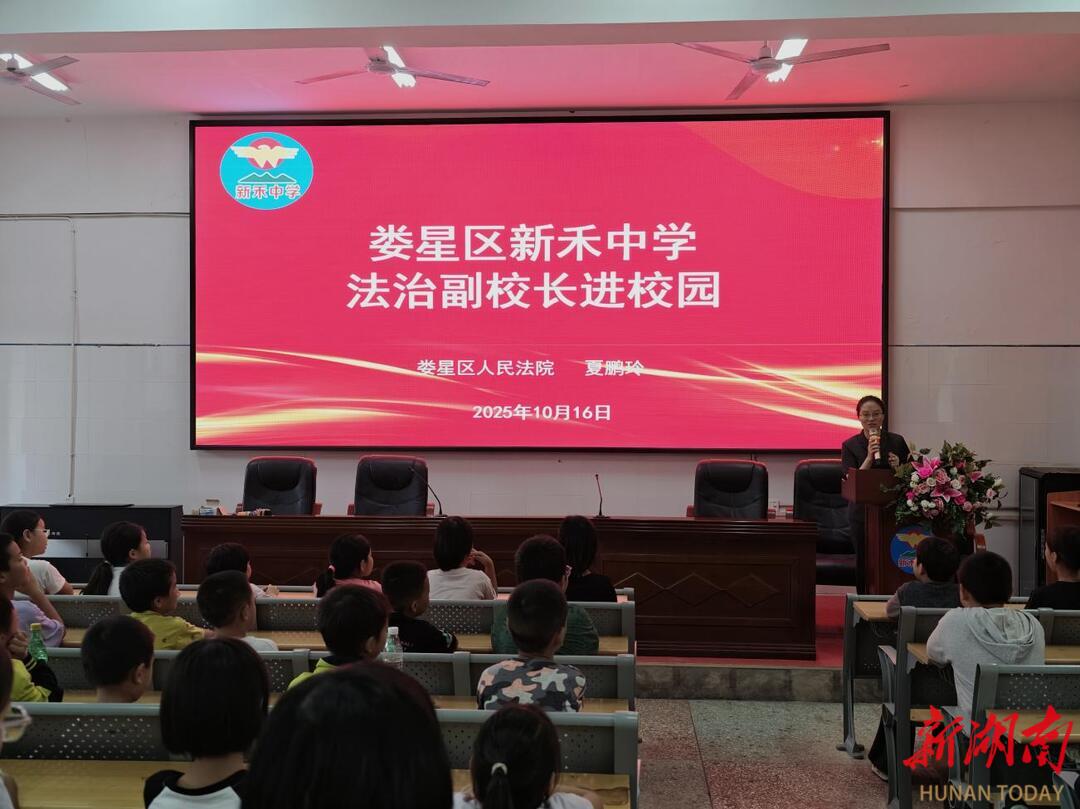 科教新报·新湖南客户端讯(通讯员 杨志荣)近日,娄底市娄星区新禾中学法治副校长、娄星区人民法院法官夏鹏玲再次来到学校,聚焦“预防暴力伤害,向校园欺凌说不”与“珍爱生命,远离毒品”两大关键议题,为全体师生带来了一场主题鲜明、内容扎实的法治宣讲盛宴。