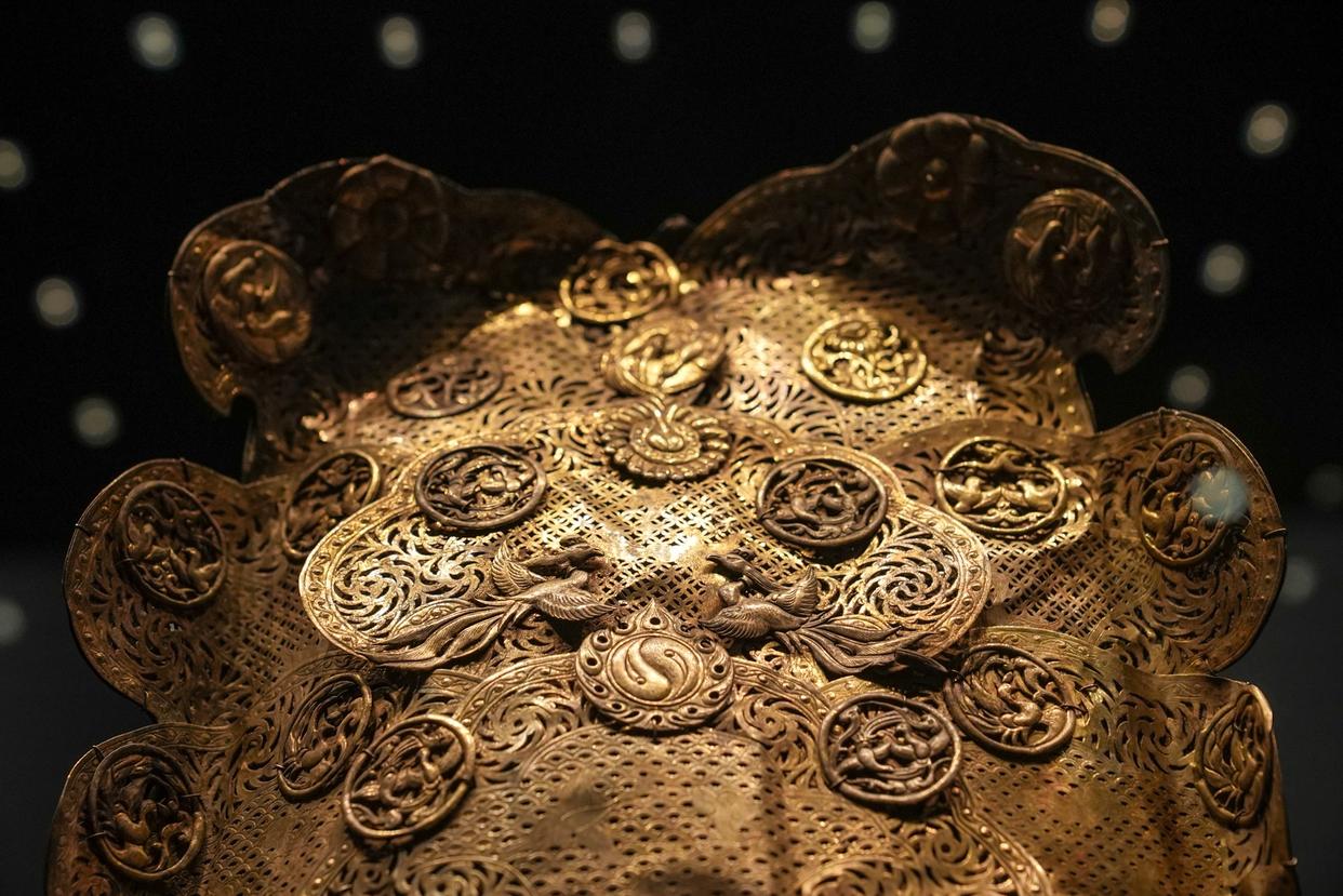 (“黄金缕——香港故宫文化博物馆藏古代金器展”在首都博物馆开幕。图为双凤戏珠纹卷云冠。)
