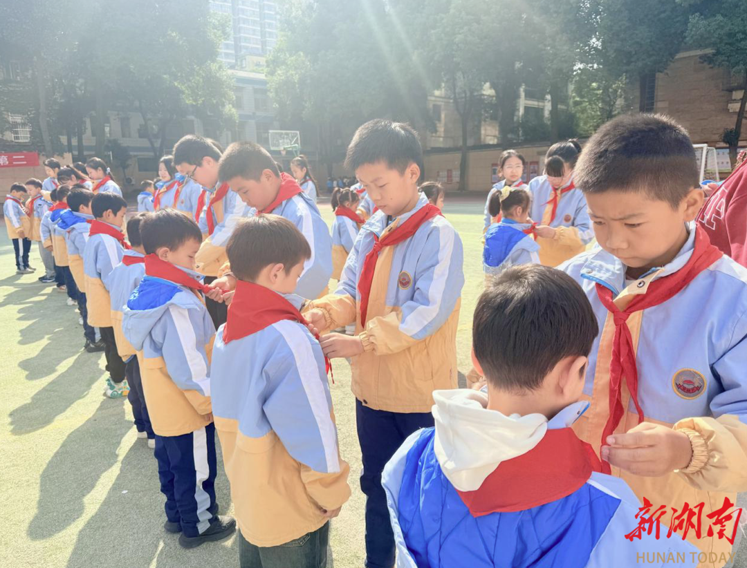 “授予队员标志”环节,老队员为新队员佩戴红领巾,新老队员互敬队礼,完成少先队精神接力传递。老队员代表分享成长感悟并鼓励新队员践行使命;新队员代表承诺遵守队章、努力学习,争做社会主义接班人。