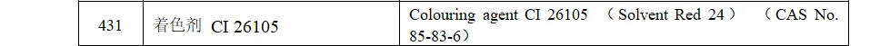 新京报贝壳财经记者查询国家药品监督管理局2021年发布的《化妆品禁用原料目录》发现,第431号为“着色剂 CI 26105”,英文名是“Solvent Red 24”,也就是苏丹红Ⅳ,其CAS号(化学文摘登记号)为85-83-6。