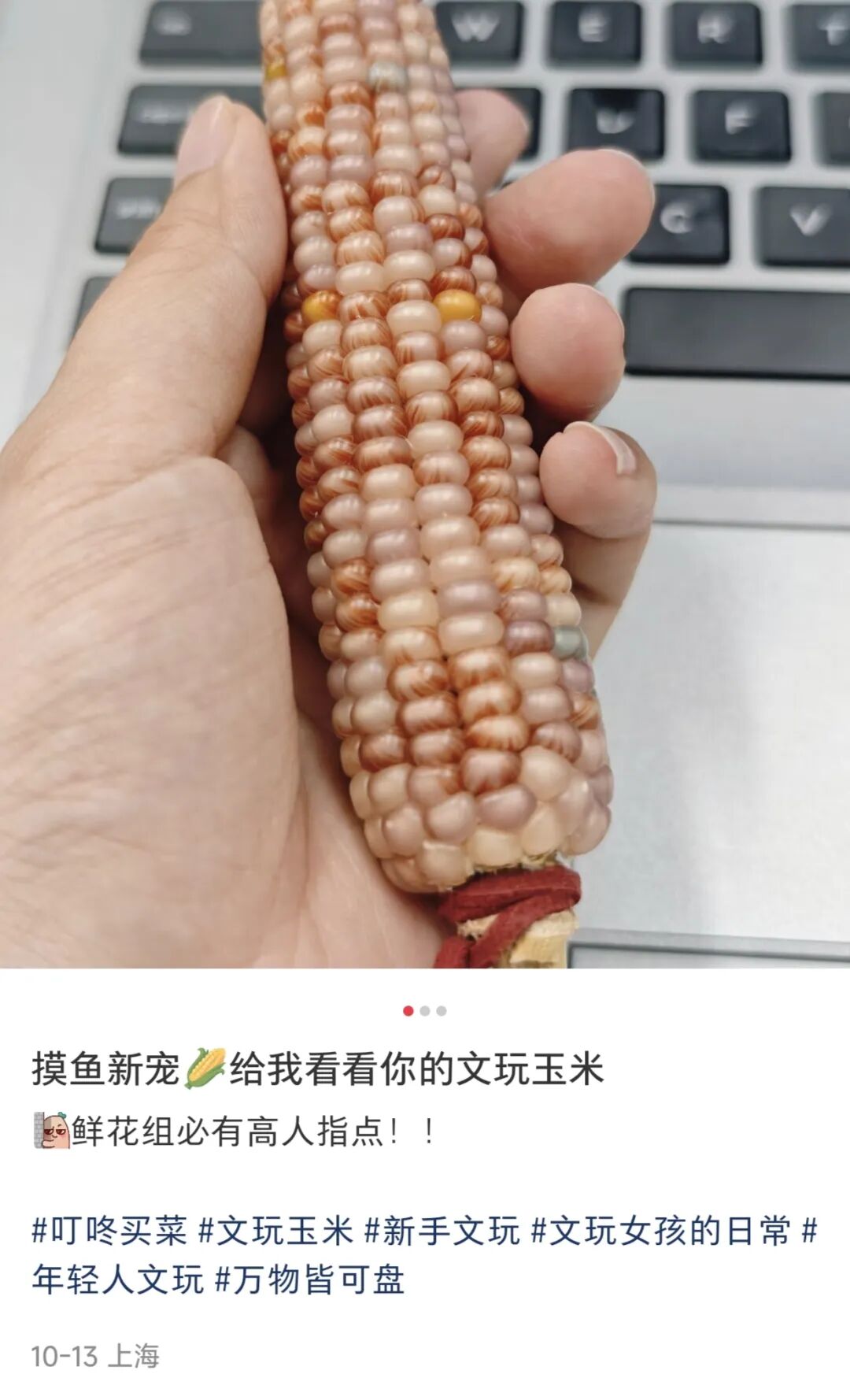 文玩卖家李希表示说,“这和之前流行的盘核桃、盘木质手串其实没有什么区别。”事实上,除了盘玉米,社交平台上还有各种各样的“日常用品盘玩”。不少年轻人开始“盘钥匙扣”“盘钢笔”“盘手机壳”……他们并非刻意追求“包浆”,而是通过长期使用、摩挲,让这些日常用品逐渐能够带上“个人痕迹”。