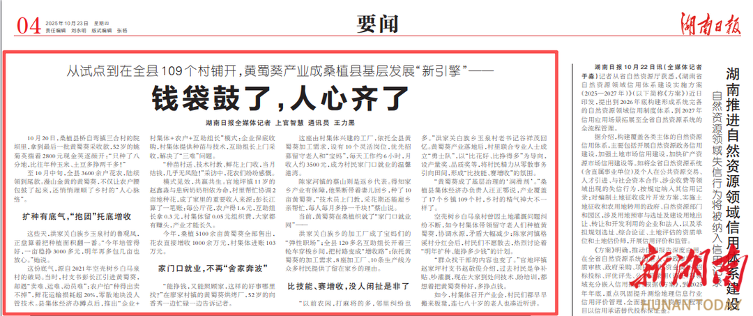 至10月中旬,全县3600余户花农,陆续领到尾款。漫山金黄的黄蜀葵,不仅让农户腰包鼓了起来,还悄悄理顺了乡村的“人心脉络”。