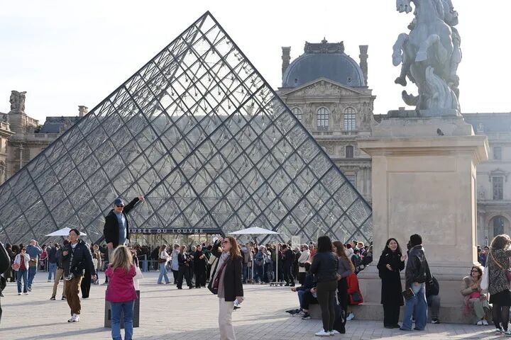 10月22日,在法国巴黎,大量游客聚集在卢浮宫博物馆的玻璃金字塔入口前。新华社记者张百慧摄