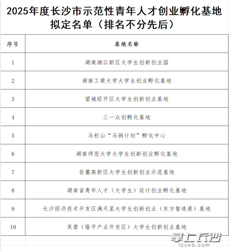 湖南湘江新区大学生创新创业园、湖南工商大学大学生创业孵化基地、望城经开区大学生创新创业基地、三一众创孵化基地、马栏山“马驹计划”孵化中心、湖南师范大学大学生创新创业孵化基地、岳麓高新区大学生创新创业示范基地、湖南省青年人才(大学生)设计创业孵化基地、长沙经济技术开发区满天星大学生创新创业(东方智造港)基地、芙蓉(隆平产业开发区)大学生创新创业基地等10家基地拟获评2025年度长沙市示范性青年人才创业孵化基地。