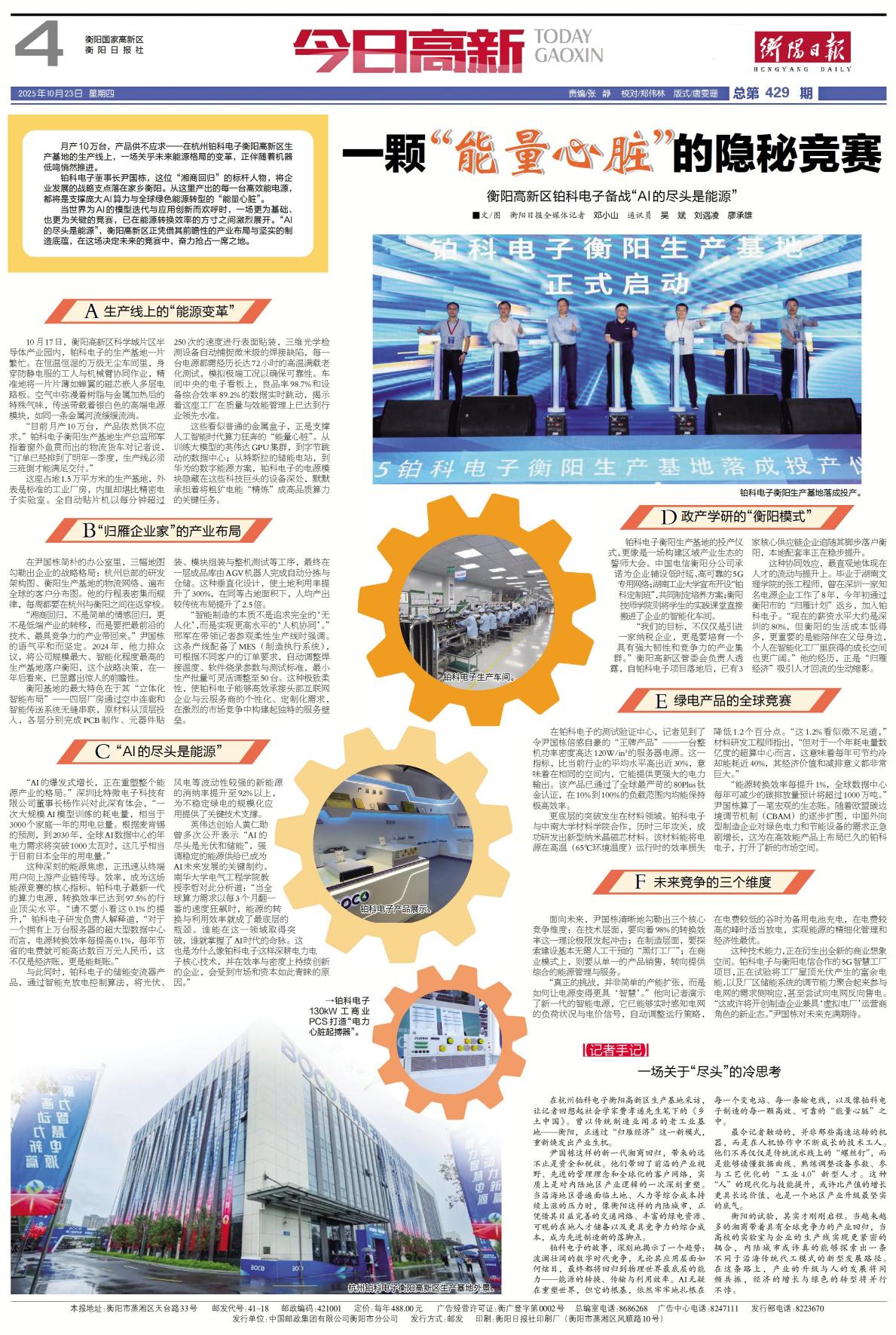 铂科电子董事长尹国栋,这位“湘商回归”的标杆人物,将企业发展的战略支点落在家乡衡阳。从这里产出的每一台高效能电源,都将是支撑庞大AI算力与全球绿色能源转型的“能量心脏”。
