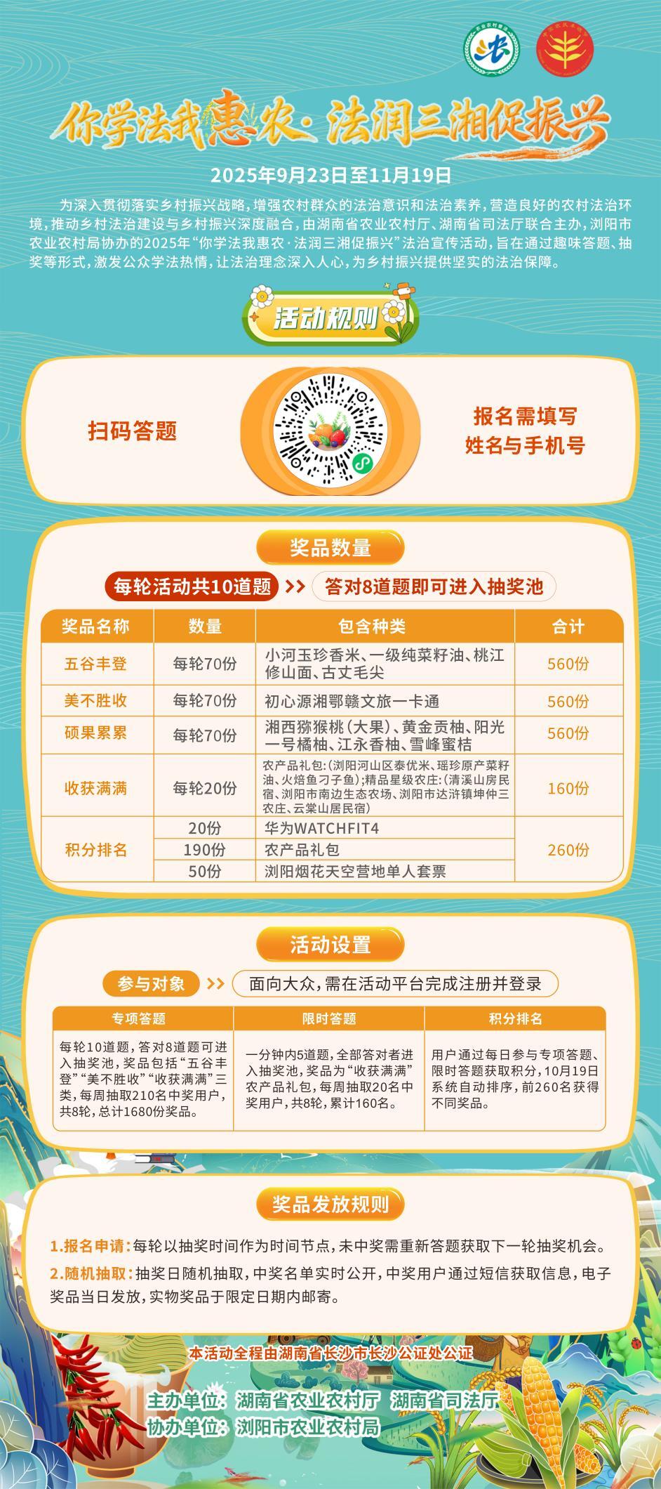 新湖南客户端10月23日讯(记者 曹晓林)10月22日,由湖南省农业农村厅与湖南省司法厅联合主办、浏阳市农业农村局协办的“你学法我惠农·法润三湘促振兴”线上答题活动第四轮抽奖仪式在长沙举行。
