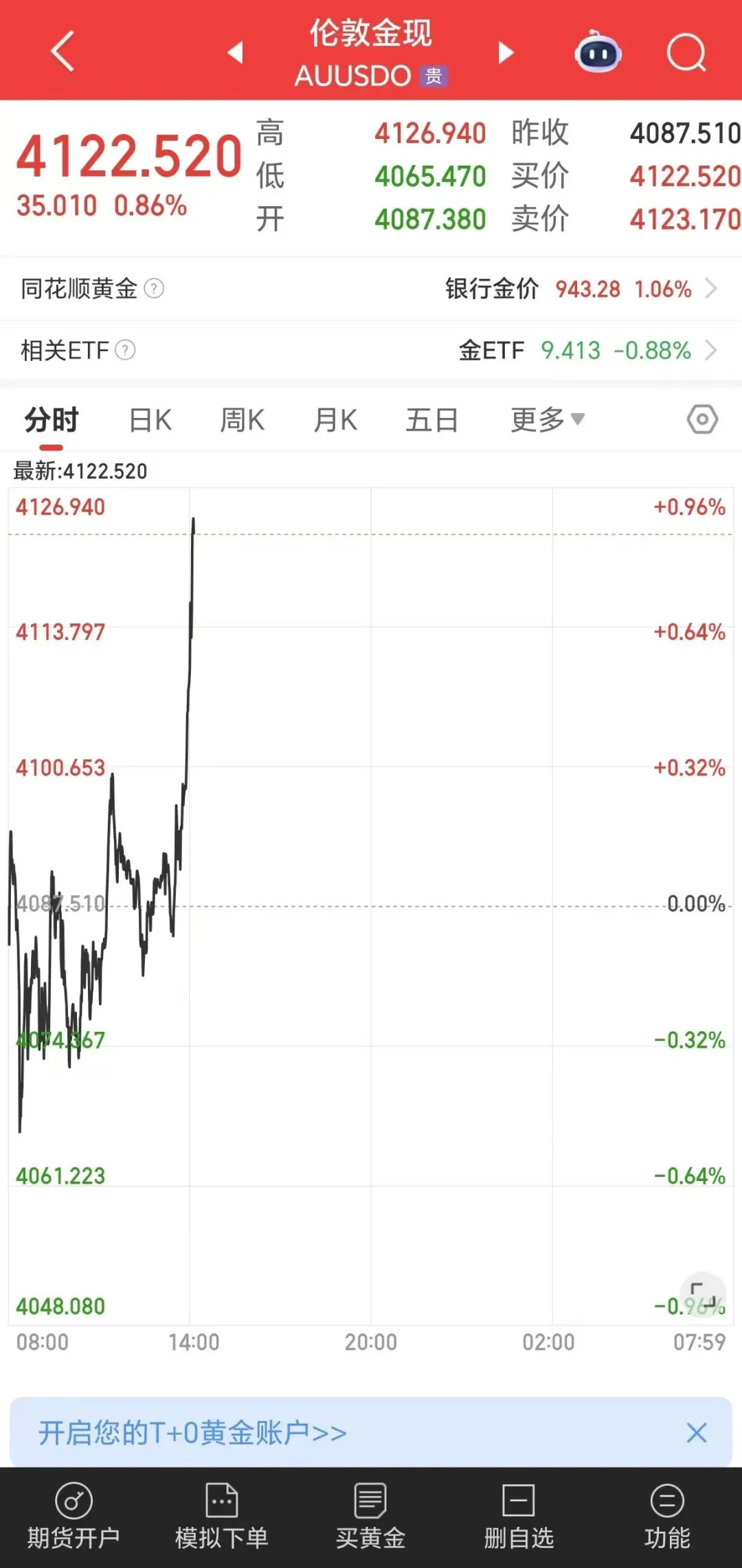 北京时间10月23日早间,国际金价上涨,COMEX黄金最高触及4133.6美元/盎司,伦敦金现最高触及4116.33美元/盎司。