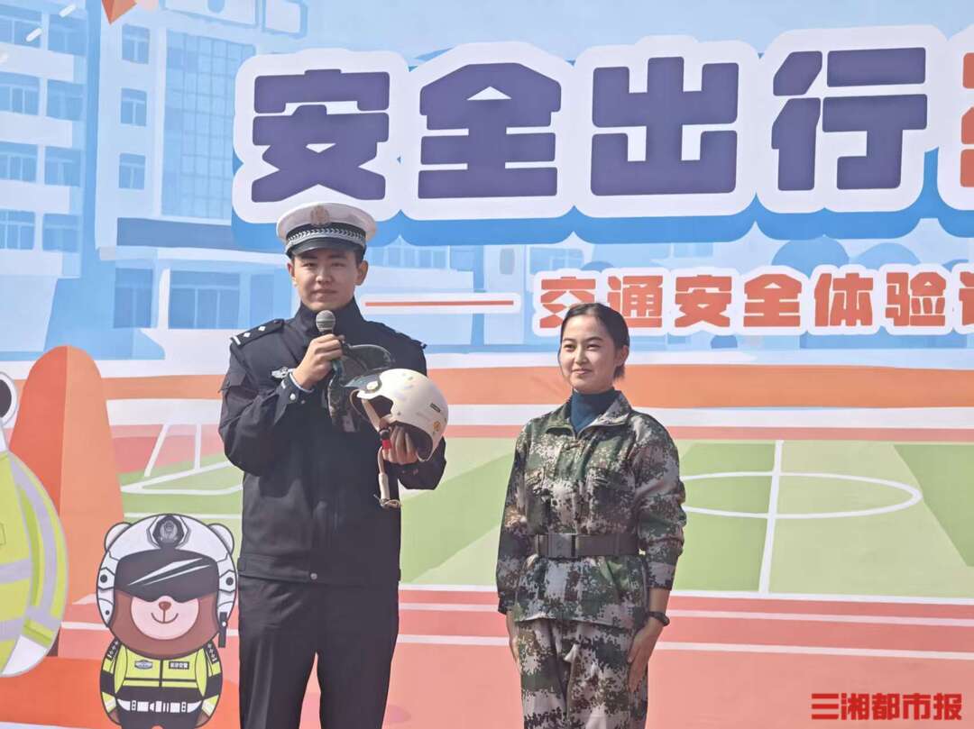 长沙交警向同学们介绍头盔的正确佩戴方式。吴忠强摄
