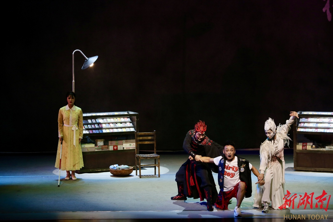 通过人物关系折射人性的多面性。戏剧矛盾冲突随着剧情的推进慢慢呈现在观众眼前,亮亮经营小烟摊生意本已不易,丢失一包“和天下”对她来说是莫大的损失。但刘小毛为了消解来犯的烟瘾,顺利度过无烟可抽的难熬夜晚,一心只想顺走一包烟。他也反复挣扎过,编剧用细腻的笔触描述了偷与不偷的纠结过程,而导演则在二度创作中巧妙地设计了“天使”和“恶魔”角色,用黑、白主色调的二次元服装幻化出两个形象,将刘小毛的内心戏具象化,一个阻止他,一个怂恿他,演绎恶念与道德的拉扯,配合旋子、背包、抢背等程式化动作和一些杂技技巧,使舞台上的戏剧语言既灵动又丰富,这是本剧的亮点之一。