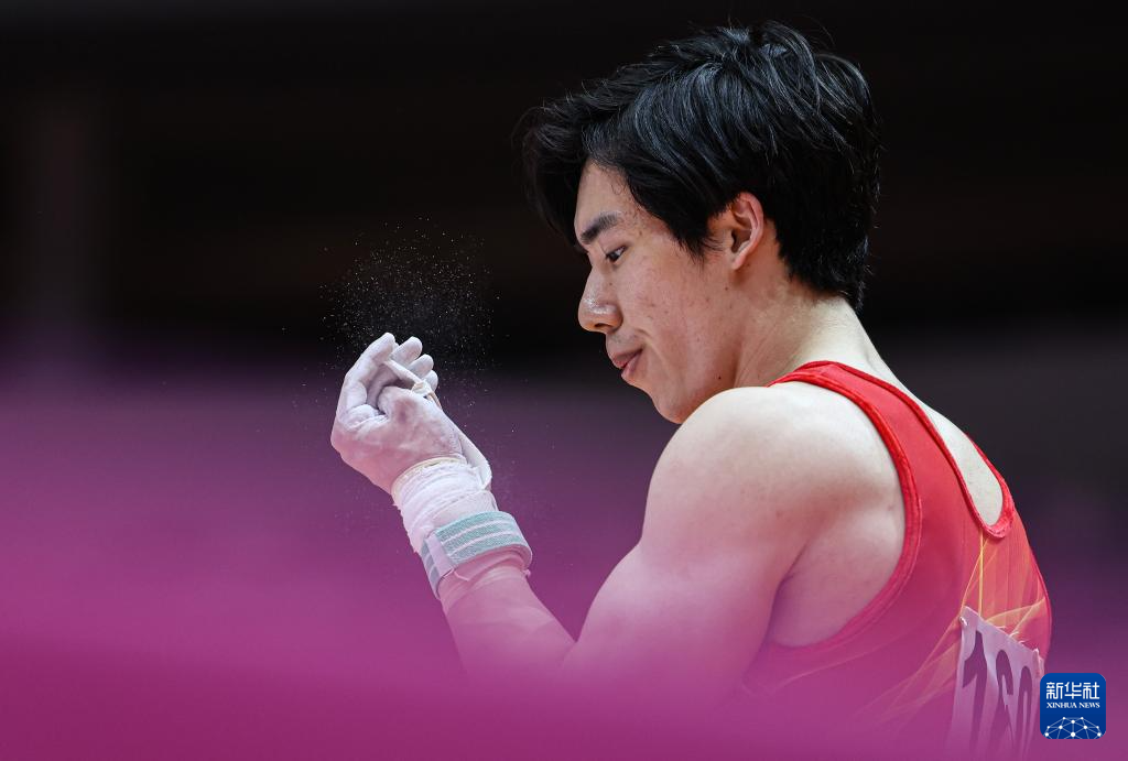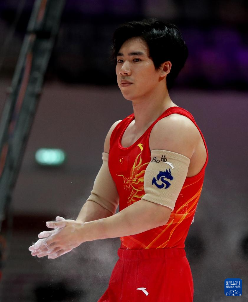 10月22日,张博恒在男子个人全能决赛单杠项目比赛前。