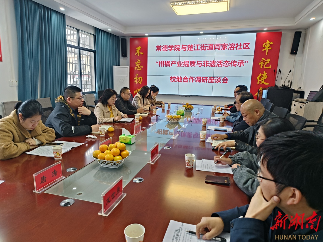 闫家溶社区名誉主任、中南大学中国式现代化品牌智库专家唐涛主持座谈会。楚江街道主要负责人对常德学院专家团队的到来表示欢迎,指出本地柑橘产业基础扎实、皮影非遗资源丰富,但在品牌建设、市场拓展与非遗传承方面仍存在提升空间,期待以此次合作为契机,推动问题破解与发展升级。