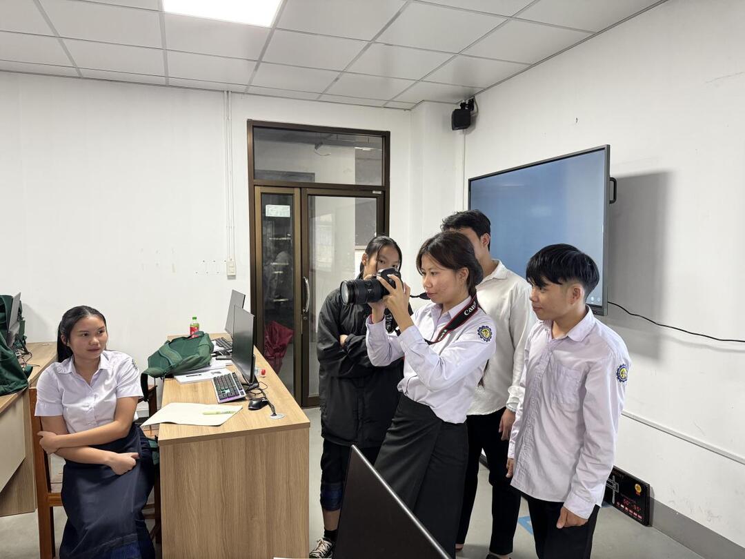 在《商品信息采集》课堂上,易文伟结合老挝本土产业特色,以当地大米、木雕、丝绸等特色产品为实操素材,系统讲解室内拍摄环境搭建、光影分层运用、产品细节特写构图等核心技能;指导学生完成从拍摄方案设计、素材拍摄到主图短视频制作的全流程实践。课堂上,学生们以小组为单位设计拍摄场景,开展后期制作,学习热情持续高涨。