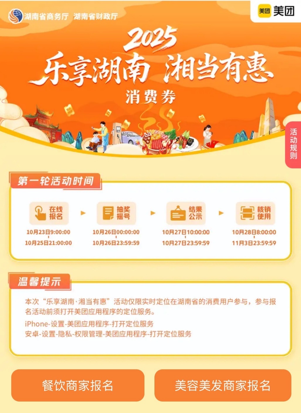 作为本次消费券的指定合作平台,美团App已上线主题活动专区。即日起至10月25日21时,手机定位在湖南省的消费者,即可搜索“乐享湖南”进行餐饮类及美容美发类消费券报名。每轮报名结束后,由公证机构摇号确定中签名单,电子券将自动发放至中签用户平台账户。首轮中签的消费者即可在10月28日至11月3日期间进行核销使用。