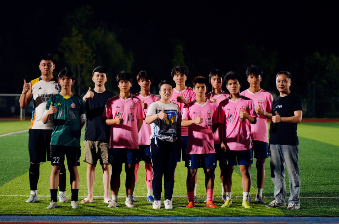 征战湘超的常德市德善学校9名师生球员合影。在校园足球场