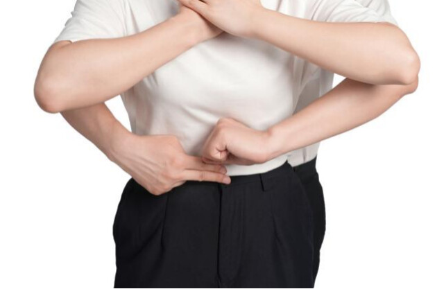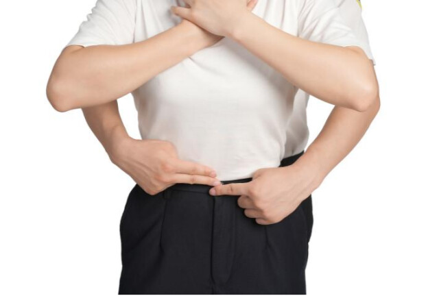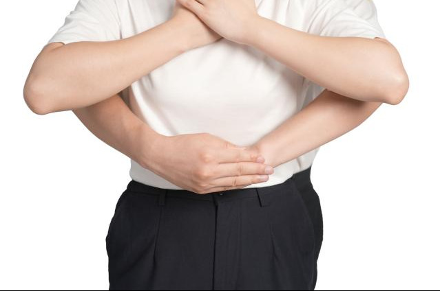 3. 另一只手紧握拳头(呈“石头”状),拇指朝内,拳眼贴紧患者腹部,放在“剪刀”上方。