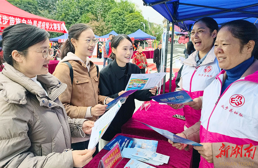 10月23日,城步苗族自治县儒林广场,大学生向县妇联工作人员了解就业信息、创业政策和社保服务。当天,该县举办2025年高校毕业生秋季专场招聘会。14家本地企业提供300个就业岗位,20家机关单位现场提供政策咨询,吸引众多求职者前来应聘。 严钦龙 于美云 摄影报道(湖南图片库)