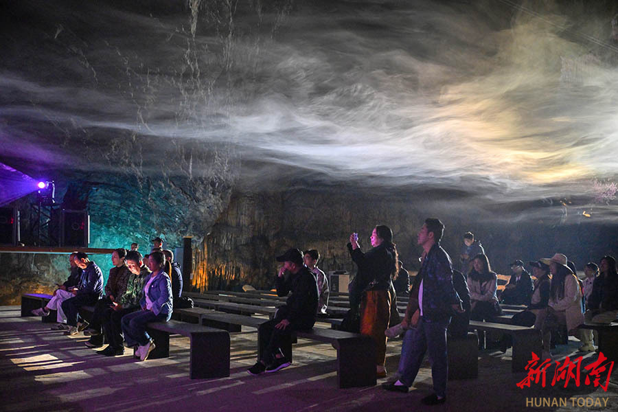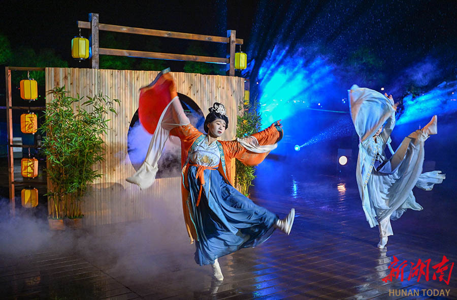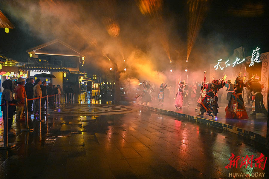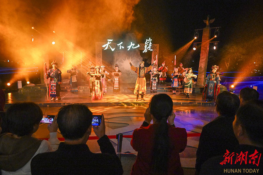 10月22日晚,宁远县九嶷山南风集《天下九嶷》大型实景演艺吸引游客驻足观看。近年来,宁远县九嶷山景区以舜文化为核心,通过科技手段创新演绎传统文化,打造沉浸式文旅体验,促进文旅产业深度融合发展。湖南日报全媒体记者 郭立亮 童臻熙 通讯员 李文 摄影报道