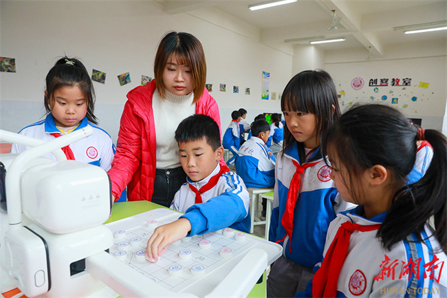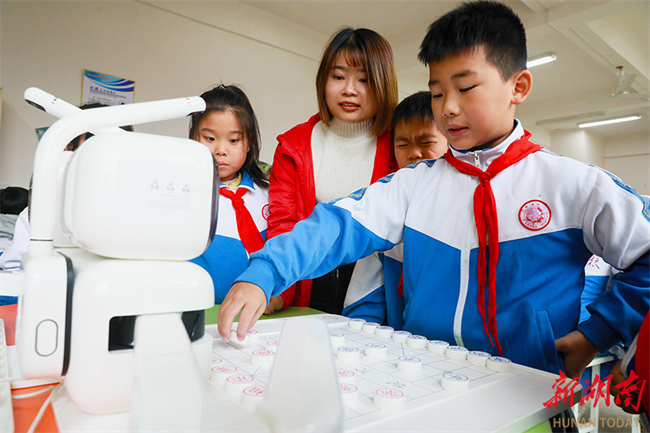 A student plays Chinese chess against an AI chess robot at the Furong School in Xintian County on October 22. In recent years, the county has been making vigorous efforts to advance digitalization in education. It has introduced innovative forms of education into its after-class services, such as intelligent Chinese chess and calligraphy. These human-machine interactive programs are expected to ignite students' enthusiasm for learning and foster their comprehensive development. (Photo/Liu Guixiong and He Xiaojun)