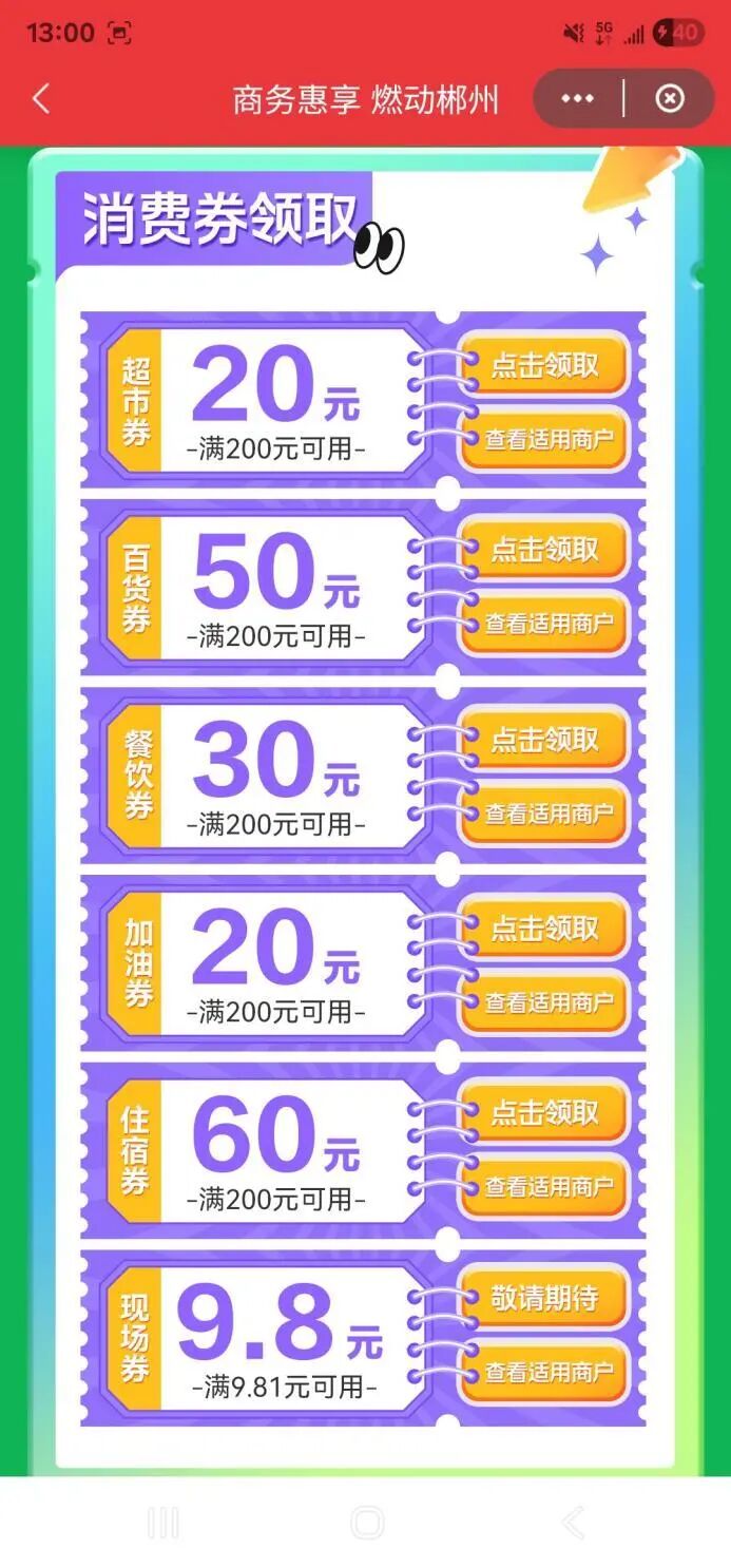 郴州队比赛前3日(含比赛日),发放消费券。进入活动页面后,选择目标票券“点击领取”,即可领取优惠券。