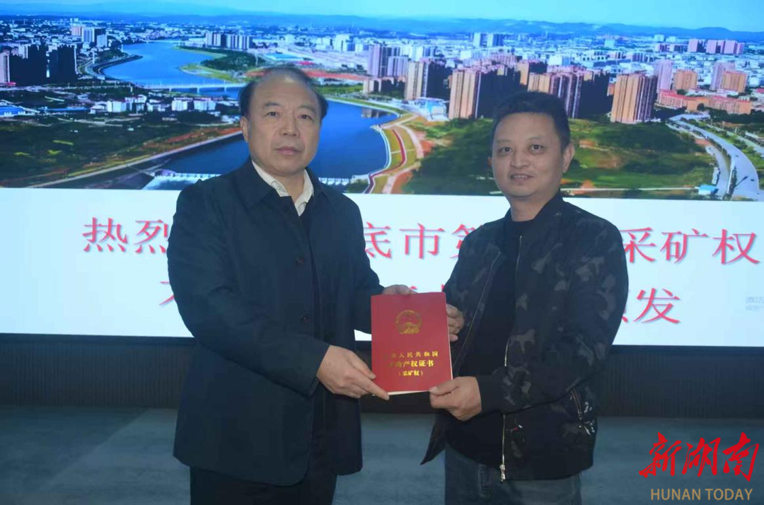 (图为娄底市自然资源和规划局党组书记、局长刘文伟为企业颁发该市首本采矿权不动产权证书)
