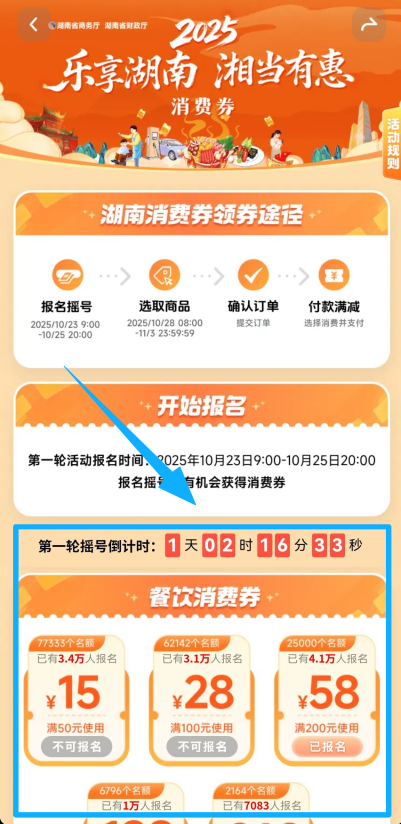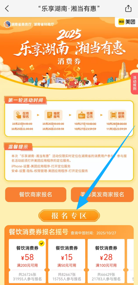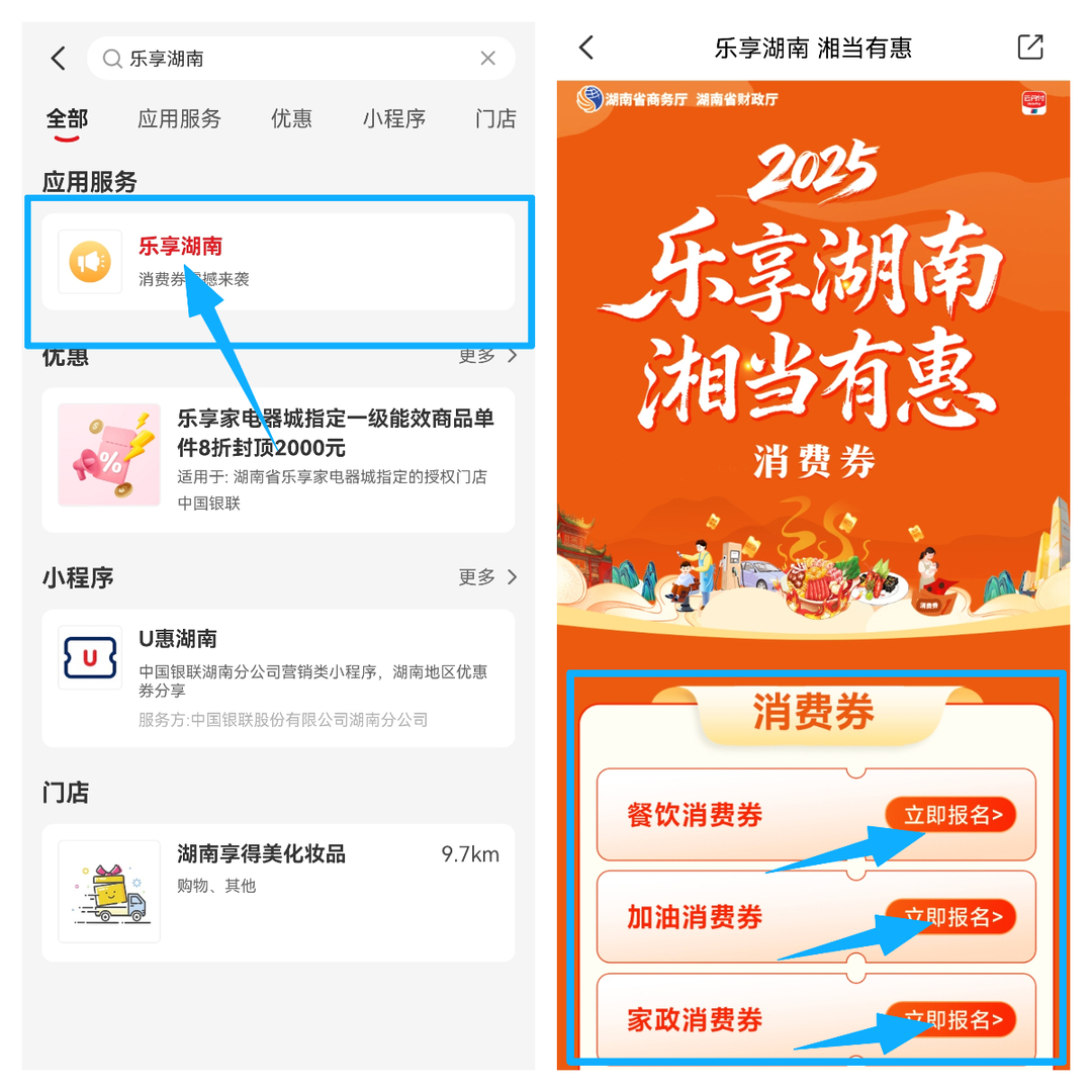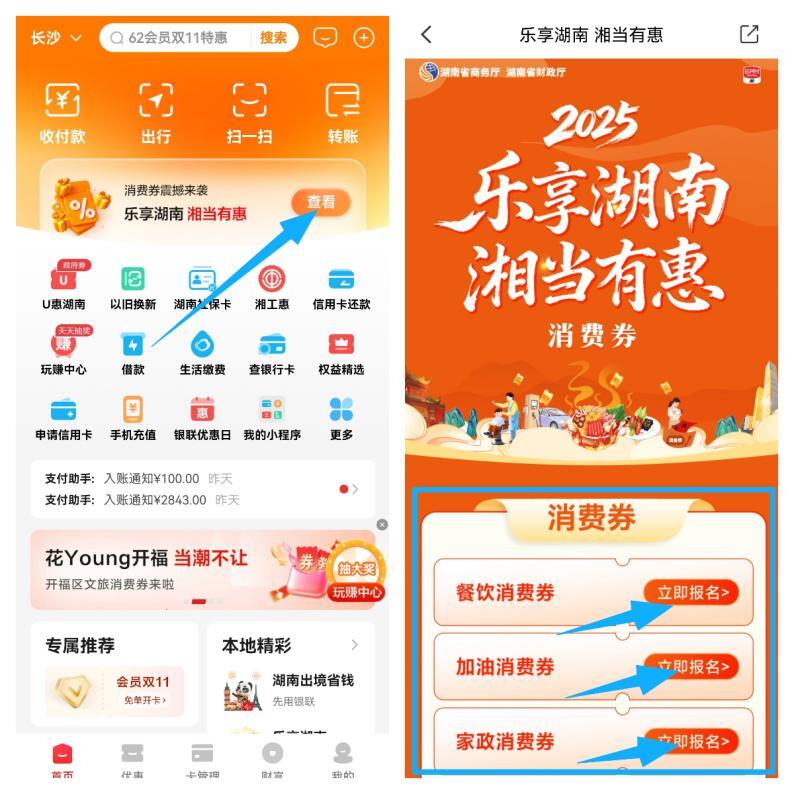 登录云闪付APP,点击首页“乐享湖南·湘当有惠”专区进行报名。