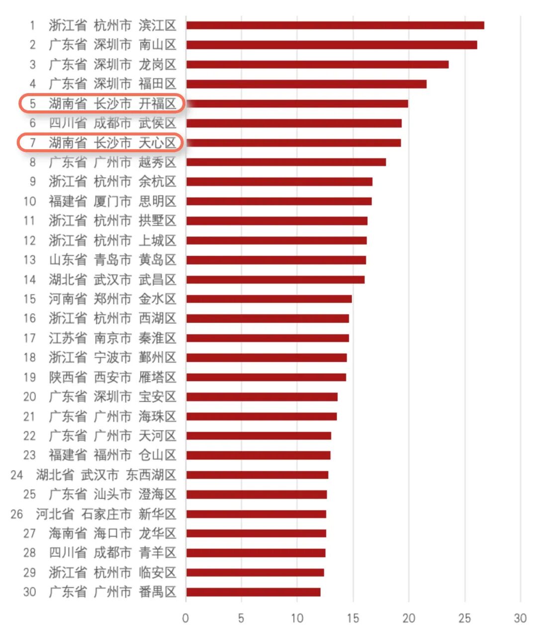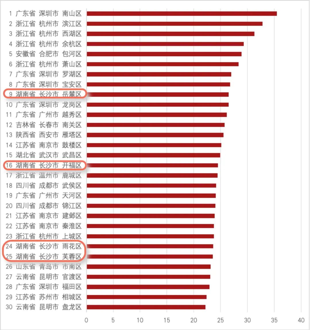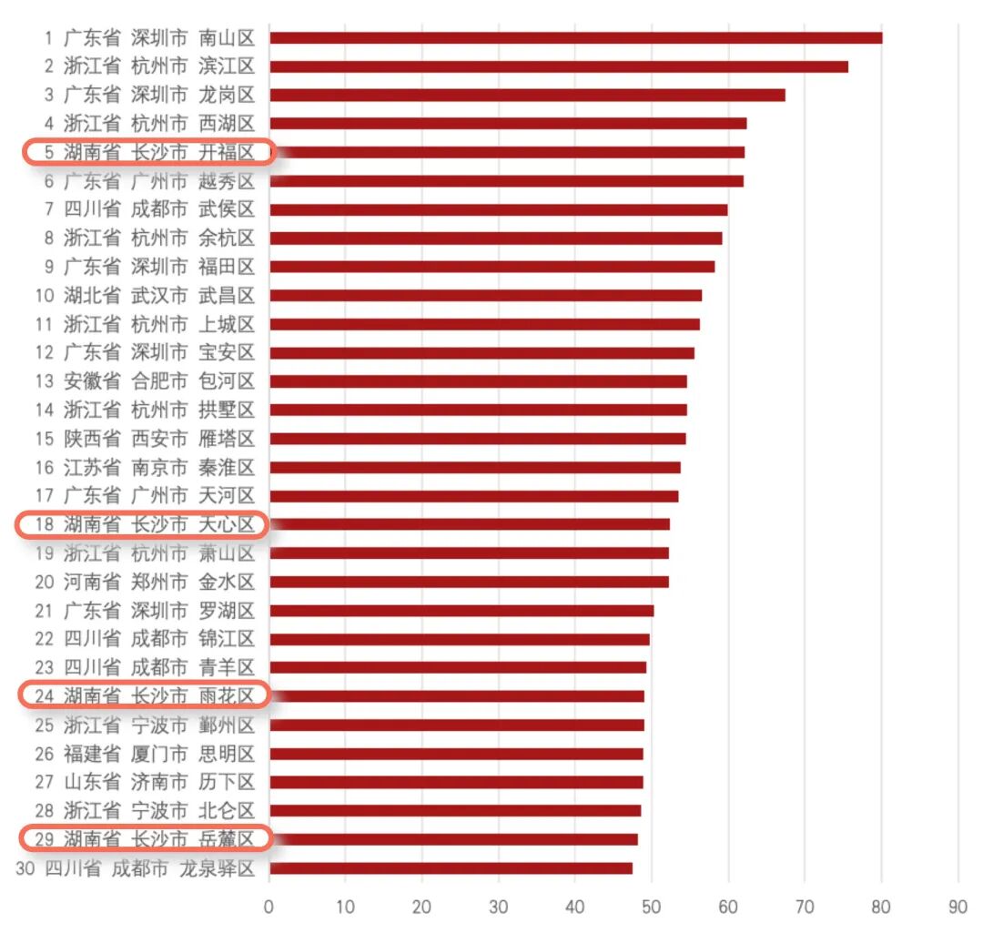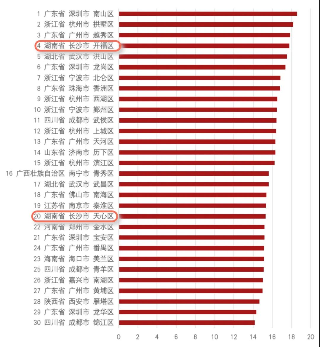 综合指数城市上榜数其中,开福区、天心区、雨花区、岳麓区进入中国文化产业竞争力百强区综合指数排名Top30。