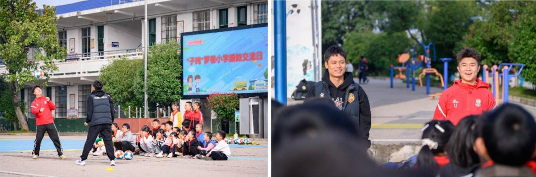 作为本次活动的亮点之一,湘超联赛球员为该校多个年级带来了专业的足球教学。在操场的东西两侧,他们通过系统的基本功训练、趣味的互动游戏,向孩子们展现了足球运动的魅力。同时,刘沛林和刘浩翰还以其专业的足球技艺,以及结合赛场实战案例讲述的拼搏故事,为孩子们带来了难忘的足球课程训练体验,更感受到了团队协作与拼搏精神的深刻内涵。