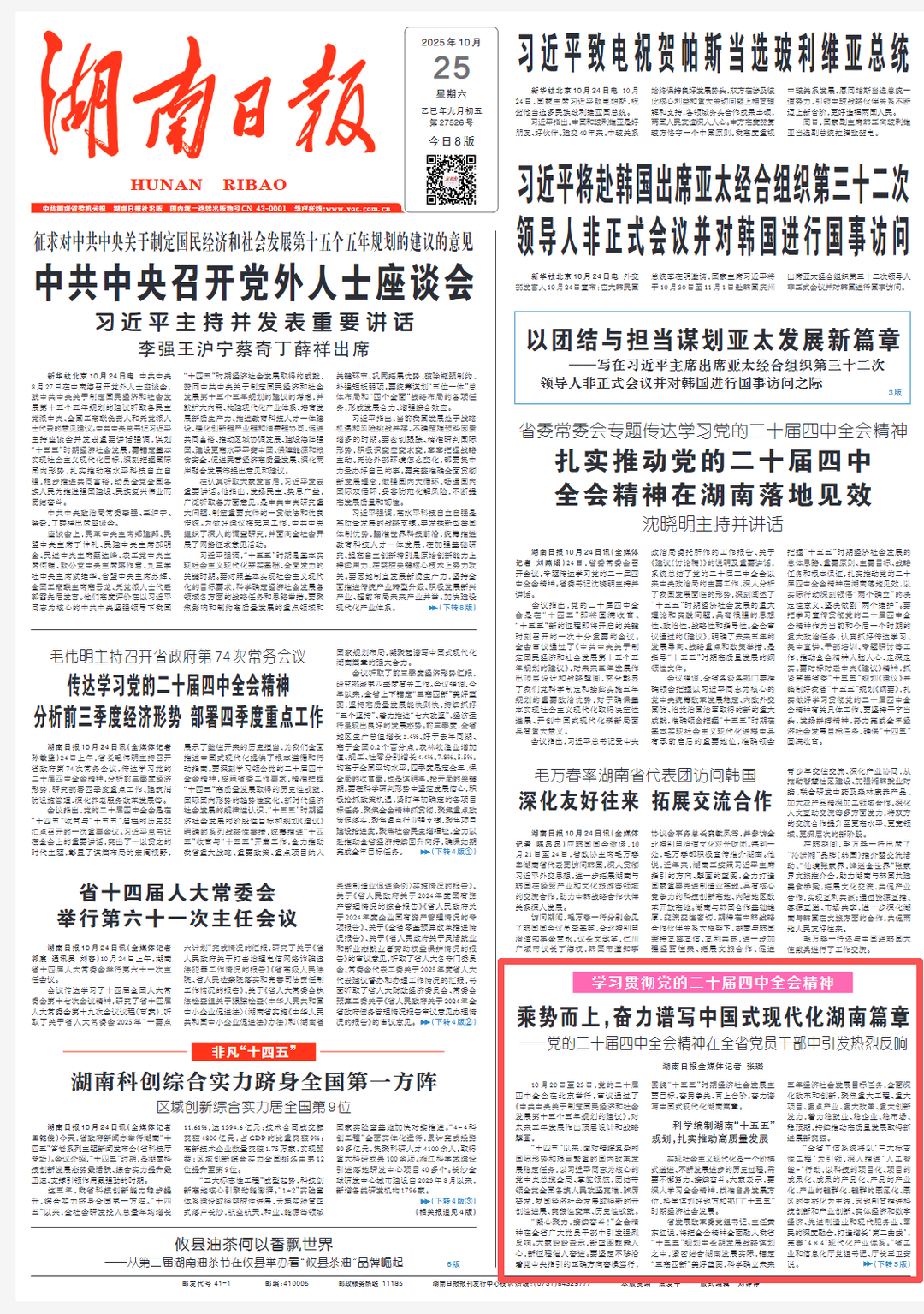 省发展改革委党组书记、主任黄东红说,将把全会精神全面融入我省“十五五”规划中长期发展战略谋划之中,紧密结合湖南发展实际,锚定“三高四新”美好蓝图,科学确立未来五年经济社会发展目标任务,全面深化改革和创新,聚焦重大工程、重大项目、重点产业、重大改革、重大创新发力,着力稳就业、稳企业、稳市场、稳预期,持续推动高质量发展取得新进展新突破。