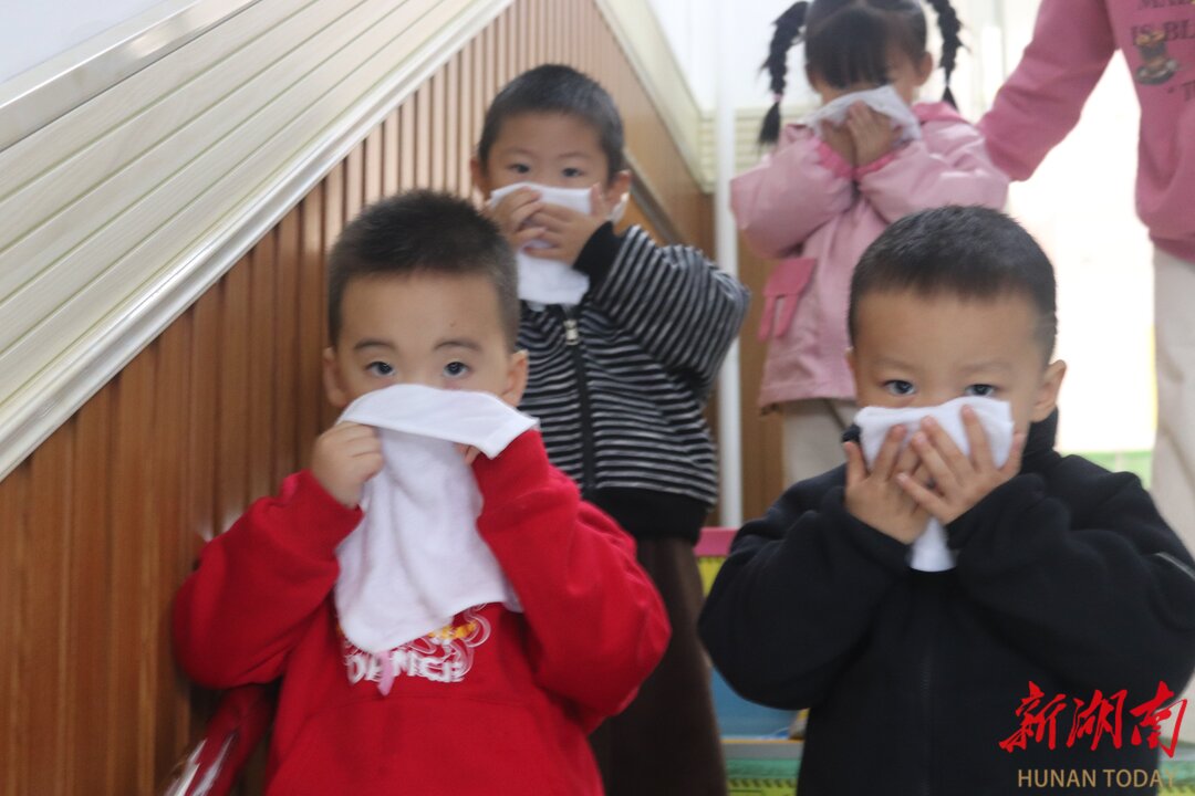 为让幼儿了解火灾危害,强化教职工应急处理能力。10月24日上午,岳麓幼儿教育集团金茂悦幼儿园开展消防演习活动。急促火警声响起后,教学楼内模拟“烟火弥漫”。各班老师带领幼儿湿毛巾捂口鼻,弯腰小步走,沿着安全通道撤离至操场,仅用2分48秒高效完成演习。(湖南日报·新湖南客户端记者 陈佳)