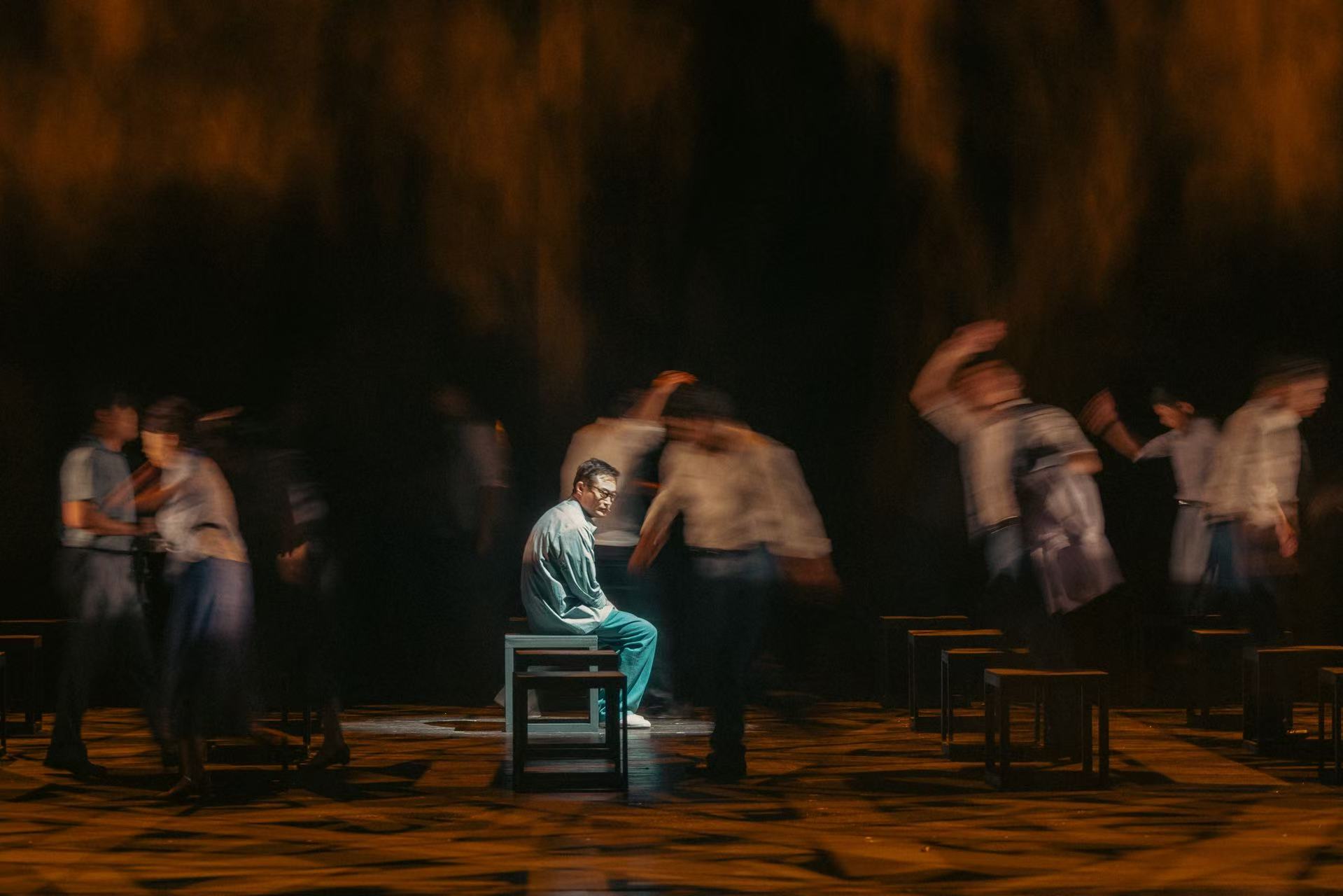 小说里场景多、时间跨度大,又如何在舞台上展现?该剧舞美设计、一级美术师唐国文介绍,他运用24个可移动方块墩,巧妙地构建出一个简约却意蕴丰富的舞台场景。这些可移动方块墩作为核心视觉符号,既是会议桌、筒子楼里的家具,又成为体制高墙与抗洪堤坝。它们通过演员的肢体调度实现时空的流畅转换,不仅打破写实主义布景的物理局限,更形成一种富有哲学意味的舞台修辞。权力结构的压抑、生存境遇的逼仄与精神世界的困局,借助这些符号获得具象而又超越具象的表达。