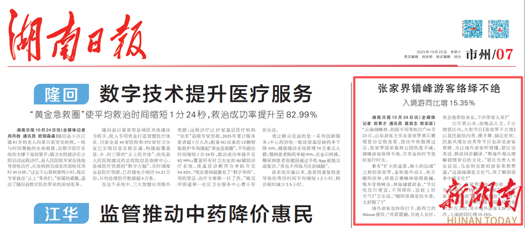 如今,张家界以生态为底、文化为魂、服务为桥,将“过路客”变“过夜客”,“观光游”升“深度体验”。10月9日至20日,张家界国家公园接待游客27.27万人次,其中境外游客5.26万人次,入境游同比增15.35%。