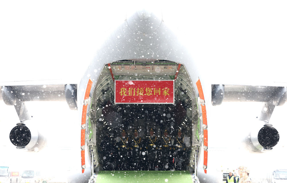 2023年11月23日,第十批在韩中国人民志愿军烈士遗骸抵达沈阳桃仙国际机场。新华社记者 曹灿 摄
