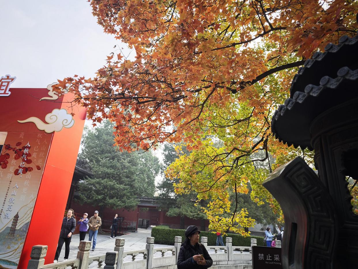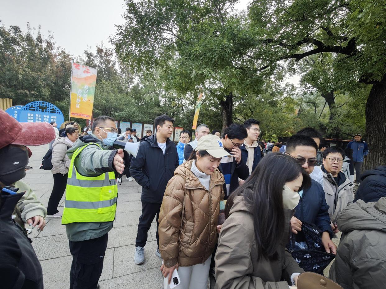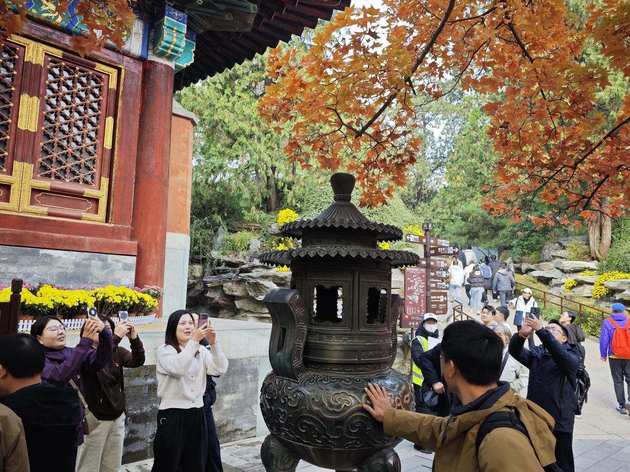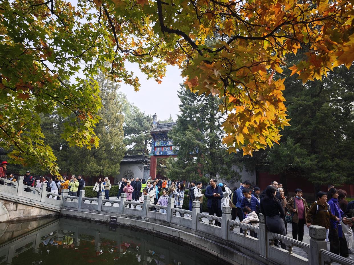 10月25日,香山公园迎来今年红叶节期间的首个游园高峰。在勤政殿前,众多游客欣赏渐入佳境的彩叶。公园的工作人员全体到位,引导游客有序入园赏红。