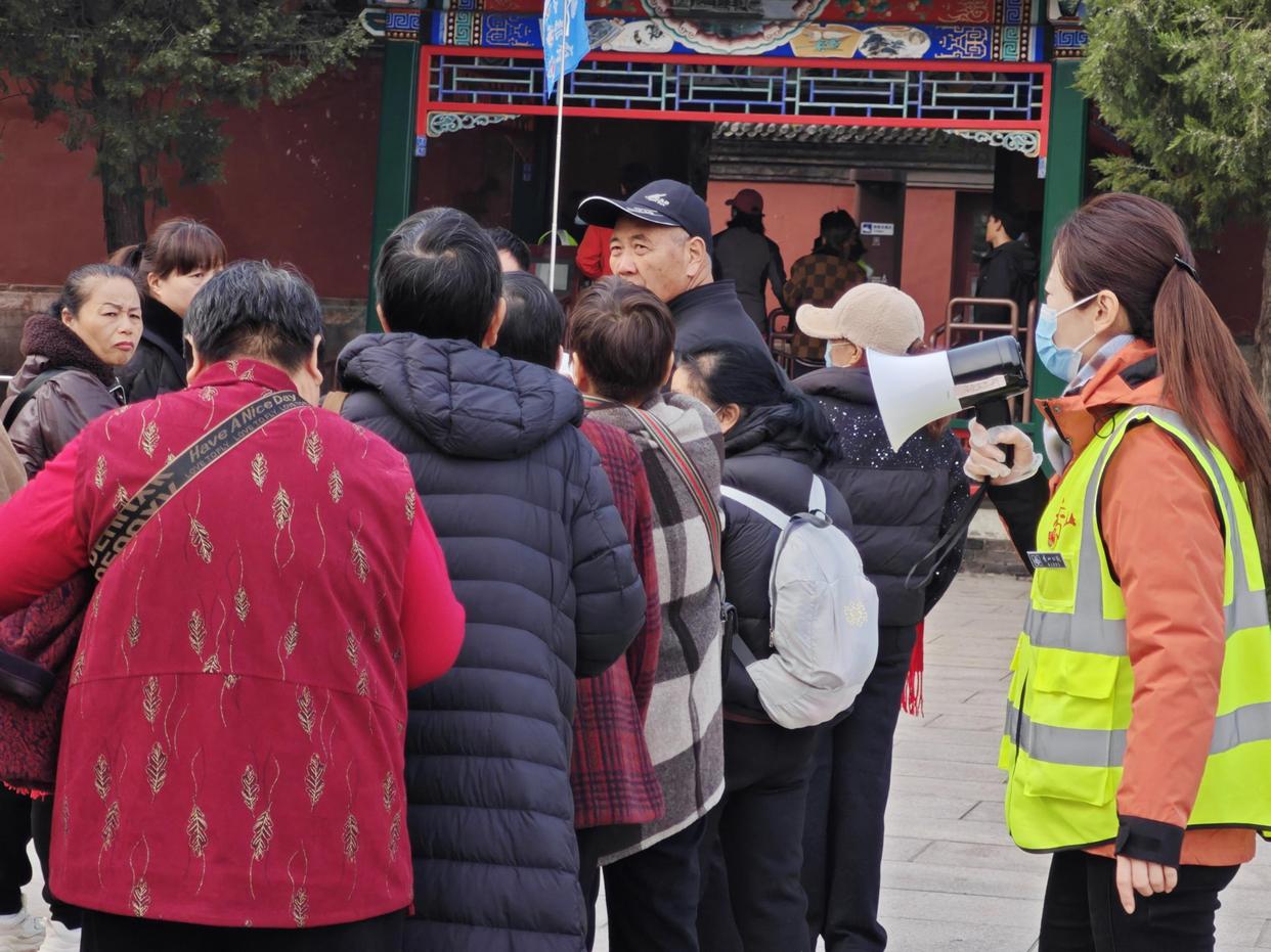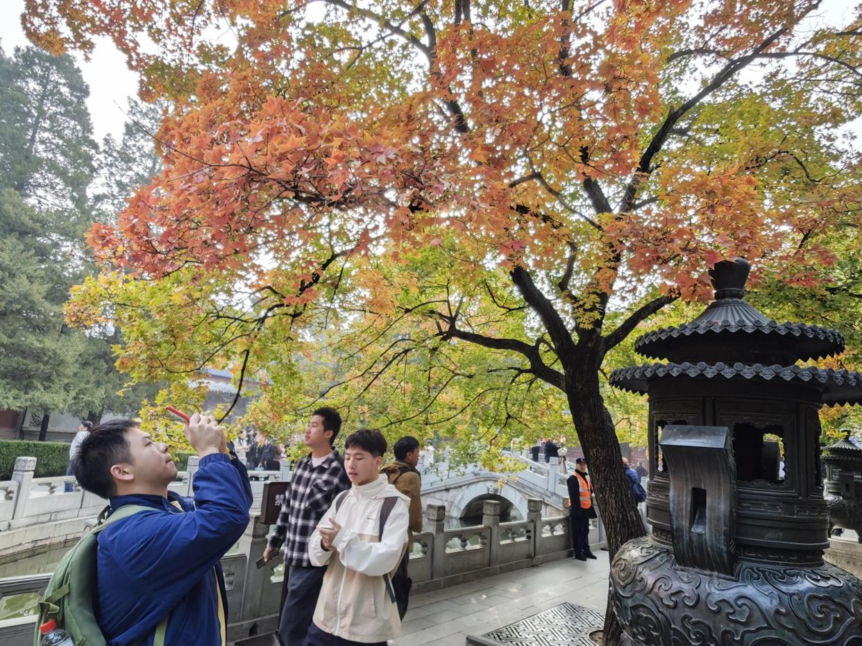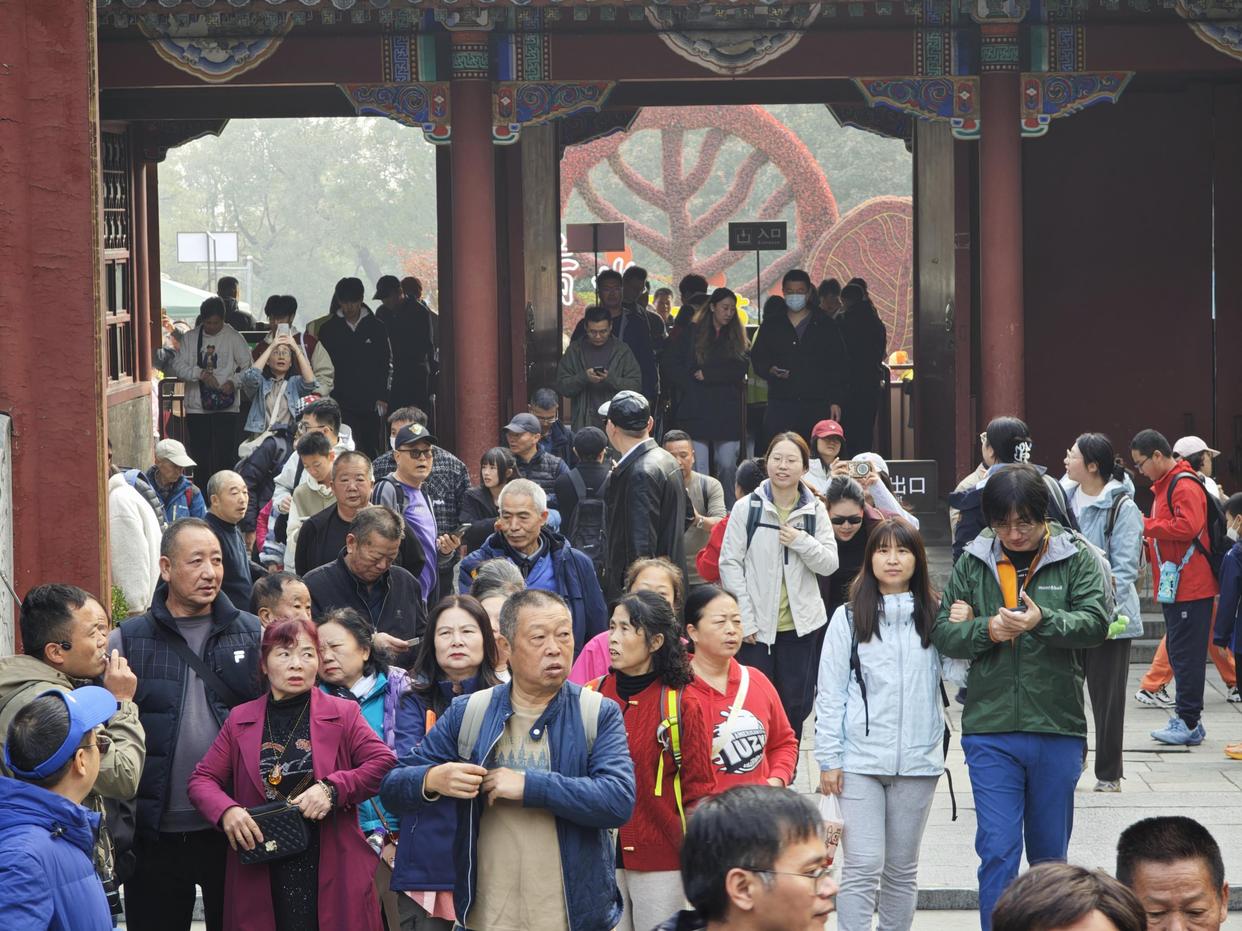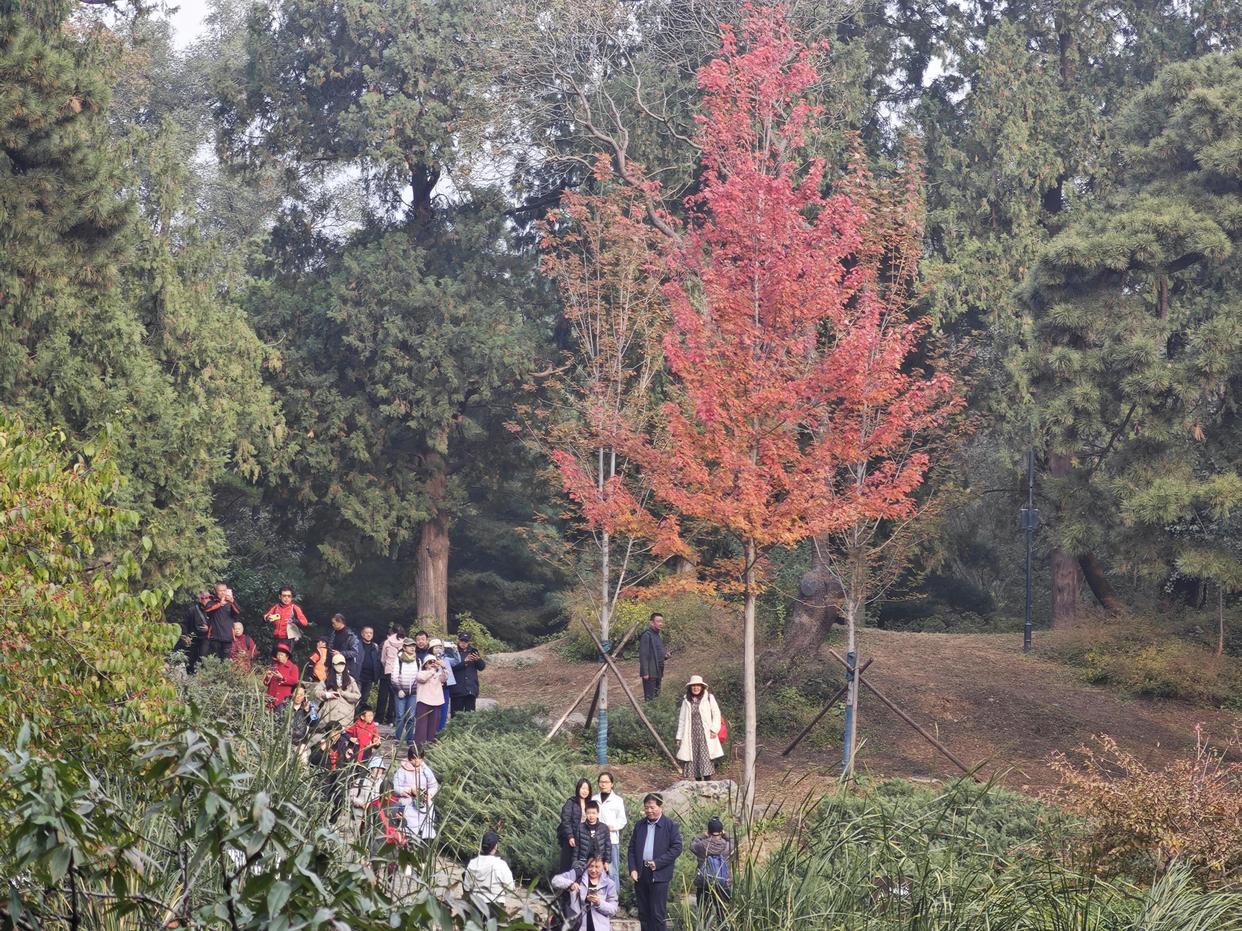 10月25日,香山公园迎来今年红叶节期间的首个游园高峰。在勤政殿前,众多游客欣赏渐入佳境的彩叶。公园的工作人员全体到位,引导游客有序入园赏红。