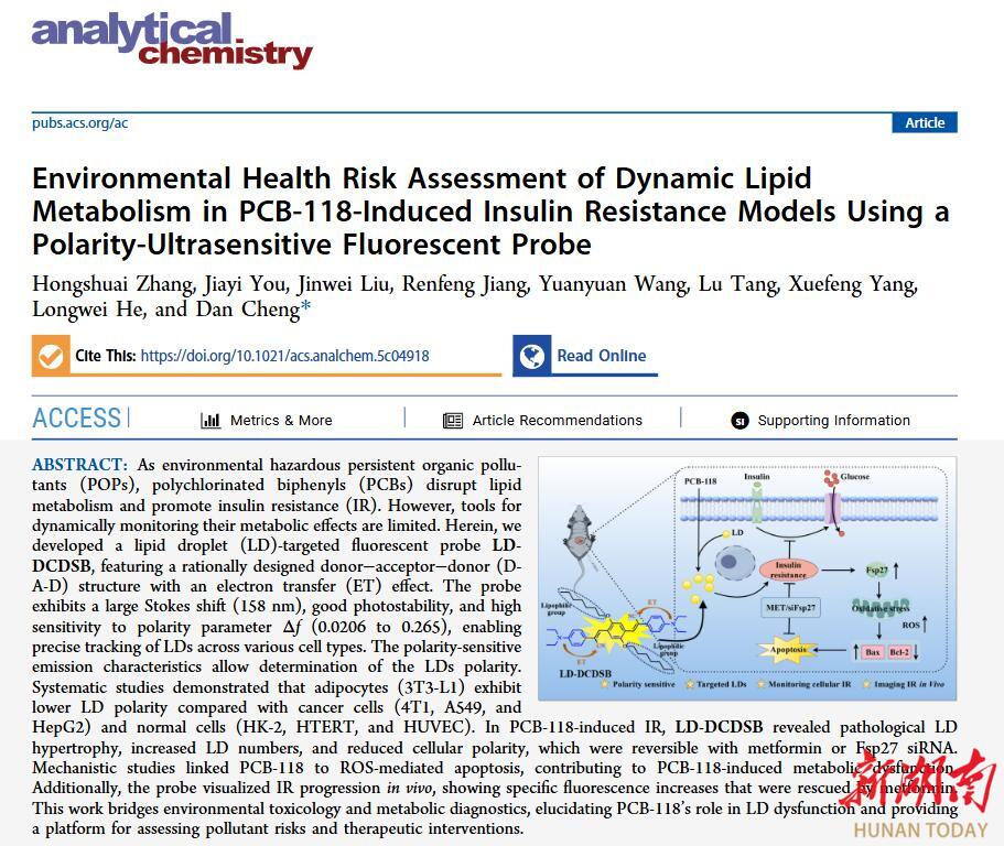 该成果以“Environmental Health Risk Assessment of Dynamic Lipid Metabolism in PCB-118 -Induced Insulin Resistance Models Using a Polarity-Ultrasensitive Fluorescent Probe”为题于近期在线发表在Analytical Chemistry上。南华大学附属南华医院张红帅博士为本文第一作者。南华大学附属南华医院程丹研究员为本研究论文的通讯作者。南华大学附属南华医院为第一通讯单位。同时,该研究还得到了南华大学药学院何隆薇教授的大力支持。