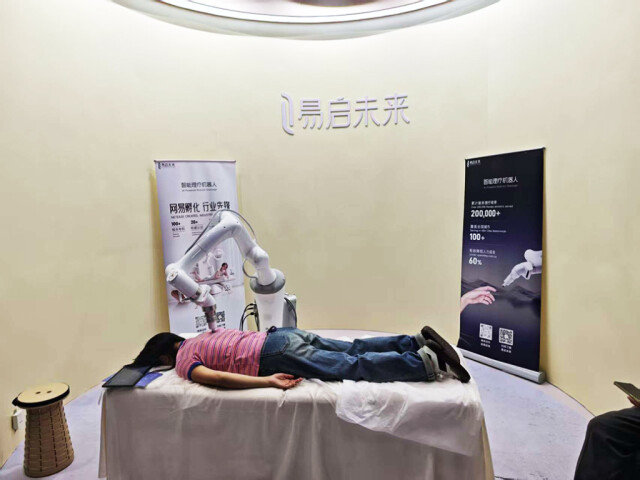 走进WTCC,最吸引人的莫过于“智能理疗机器人”,可以代替人工进行现场按摩。澎湃新闻记者在现场发现,这款理疗机器人拥有“一指禅”“磁震波”“内源热能”“筋膜再生宝”“矩阵艾灸”等多重功能,覆盖部位则包括背部、腰部、肩部、腹部和全身。